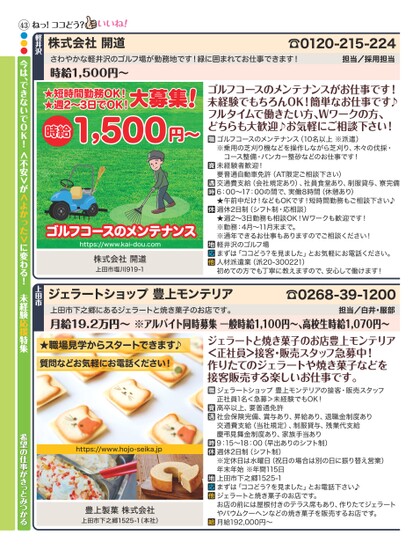 さわやかな軽井沢のゴルフ場が勤務地です!緑に囲まれてお仕事できます!時給1,500円〜☎0120-215-224担当/採用担当株式会社開道軽井沢ねっ!ココどう?★短時間勤務OK!★週2〜3日でOK!時給1,500円〜ゴルフコースのメンテナンスhttps://www.kai-dou.com株式会社開道上田市塩川919-1ゴルフコースのメンテナンスがお仕事です!未経験でもちろんOK!簡単なお仕事です♪フルタイムで働きたい方、Wワークの方、どちらも大歓迎♪お気軽にご相談下さい!ゴルフコースのメンテナンス(10名以上※派遣)※乗用の芝刈り機などを操作しながら芝刈り、木々の伐採・コース整備・バンカー整砂などのお仕事です!未経験者歓迎!要普通自動車免許(AT限定ご相談下さい)交通費支給(会社規定あり)、社員食堂あり、制服貸与、寮完備6:00〜17:00の間で、実働8時間(休憩あり)★午前中だけ!などもOKです!短時間勤務もご相談下さい♪週休2日制(シフト制・応相談)★週2〜3日勤務も相談OK!Wワークも歓迎です!※勤務:4月〜11月末まで。※通年できるお仕事もありますのでご相談ください!軽井沢のゴルフ場まずは「ココどう?を見ました」とお気軽にお電話ください。人材派遣業(派20-300221)初めての方でも丁寧に教えますので、安心して働けます!上田市下之郷にあるジェラートと焼き菓子のお店です。月給19.2万円〜※アルバイト同時募集一般時給1,100円〜、高校生時給1,070円〜担当/白井・服部☎0268-39-1200ジェラートショップ豊上モンテリア上田市43●●●今は、できないでOK!<不安>が<よかった>に変わる!未経験応援特集ジェラートと焼き菓子のお店豊上モンテリア<正社員>接客・販売スタッフ急募中!作りたてのジェラートや焼き菓子などを接客販売する楽しいお仕事です。ジェラートショップ豊上モンテリアの接客・販売スタッフ正社員1名<急募>未経験でもOK!高卒以上、要普通免許社会保険完備、賞与あり、昇給あり、退職金制度あり交通費支給(当社規定)、制服貸与、残業代支給慶弔見舞金制度あり、家族手当あり9:15〜18:00(早出ありのシフト制)週休2日制(シフト制)※定休日は水曜日(祝日の場合は別の日に振り替え営業)年末年始※年間115日上田市下之郷1525-1まずは「ココどう?を見ました」とお電話下さい♪ジェラートと焼き菓子のお店です。お店の前には屋根付きのテラス席もあり、作りたてジェラートやバウムクーヘンなどの焼き菓子を販売するお店です。月給192,000円〜★職場見学からスタートできます♪質問などお気軽にお電話ください!https://www.hojo-seika.jp豊上製菓株式会社上田市下之郷1525-1(本社)希望の仕事がきっとみつかる