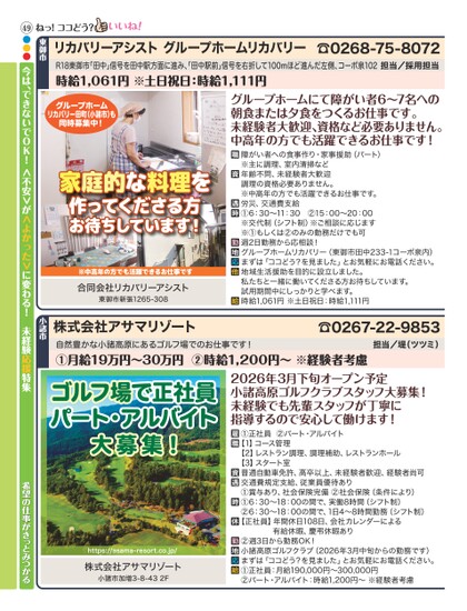 グループホームリカバリー田町(小諸市)も同時募集中!家庭的な料理を料理作ってくださる方お待ちしています!※中高年の方でも活躍できるお仕事です合同会社リカバリーアシスト東御市新張1265-308グループホームにて障がい者6〜7名への朝食または夕食をつくるお仕事です。未経験者大歓迎、資格など必要ありません。中高年の方でも活躍できるお仕事です!障がい者への食事作り・家事援助(パート)※主に調理、室内清掃など年齢不問、未経験者大歓迎調理の資格必要ありません。※中高年の方でも活躍できるお仕事です。労災、交通費支給①6:30〜11:30②15:00〜20:00※交代制(シフト制)※ご相談に応じます※①もしくは②のみの勤務だけでも可週2日勤務から応相談!グループホームリカバリー(東御市田中233-1コーポ泉内)まずは「ココどう?を見ました」とお気軽にお電話ください。地域生活援助を目的に設立しました。私たちと一緒に働いてくださる方お待ちしています。試用期間中にしっかりと学べます。時給1,061円※土日祝日:時給1,111円R18東御市「田中」信号を田中駅方面に進み、田中駅前」信号を右折して100mほど進んだ左側、コーポ泉102担当/採用担当時給1,061円※土日祝日:時給1,111円☎0268-75-8072リカバリーアシストグループホームリカバリー東御市ねっ!ココどう?☎0267-22-9853担当/堤(ツツミ)自然豊かな小諸高原にあるゴルフ場でのお仕事です!①月給19万円〜30万円②時給1,200円〜※経験者考慮株式会社アサマリゾート小諸市49●●●今は、できないでOK!<不安>が<よかった>に変わる!未経験応援特集2026年3月下旬オープン予定小諸高原ゴルフクラブスタッフ大募集!未経験でも先輩スタッフが丁寧に指導するので安心して働けます!①正社員②パート・アルバイト【1】コース管理【2】レストラン調理、調理補助、レストランホール【3】スタート室普通自動車免許、高卒以上、未経験者歓迎、経験者尚可交通費規定支給、従業員優待あり①賞与あり、社会保険完備②社会保険(条件により)①6:30〜18:00の間で、実働8時間(シフト制)②6:30〜18:00の間で、1日4〜8時間勤務(シフト制)【正社員】年間休日108日、会社カレンダーによる有給休暇、慶弔休暇あり②週3日から勤務OK!小諸高原ゴルフクラブ(2026年3月中旬からの勤務です)まずは「ココどう?を見ました」とお気軽にお電話ください。①正社員:月給190,000円〜300,000円②パート・アルバイト:時給1,200円〜※経験者考慮ゴルフ場で正社員パート・アルバイト大募集!https://asama-resort.co.jp/株式会社アサマリゾート小諸市加増3-8-432F希望の仕事がきっとみつかる