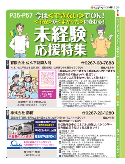 52●●●今は、できないでOK!<不安>が<よかった>に変わる!未経験応援特集希望の仕事がきっとみつかるP35-P57今は<できない>でOK!<不安>が<よかった>に変わる!未経験応援特集有限会社佐久平訪問入浴イオン佐久平店から徒歩3分!通勤便利!仕事帰りのお買物もラクラク!☎0267-68-7888担当/きよの①時給1,350円〜+諸手当②時給1,200円〜+諸手当日勤帯のみで働きやすい職場です!3人1組でのお仕事なので安心して働けます!Instagramぜひご覧になってください!有限会社佐久平訪問入浴佐久市岩村田1290-7ラークビル1F訪問入浴スタッフパート2〜3名(3人1組でのお仕事です)①正・准看護師②介護福祉士※有資格者積極採用中!社会保険完備、交通費規定支給、各種資格手当ありその他処遇改善加算あり、有給休暇あり8:30〜17:30の間で、1日5時間以上勤務から応相談日曜定休、週3日勤務からOK!曜日等ご相談ください。まずは「ココどう?を見ました」とお気軽にお電話ください。①時給1,350円〜+諸手当②時給1,200円〜+諸手当※試用期間中(1〜2ヶ月)①時給1,300円②時給1,150円※初めての方でもブランクのある方でも試用期間中は、必ず指導員が同伴しますので安心です。国道18号「西原」信号を上田方面から来て右折(市街地へ)ガストの近くです!普通自動車免許の方もOK!※免許取得制度あり準中型(5t)免許以上必須未経験でも大丈夫!職場見学も随時OK!業界未経験の方でもOKです!先輩社員がサポートするので安心!https://www.sutoku.info/株式会社酢徳小諸市市町5-4-18月給20万円〜24万円東信地域を中心にホテル、旅館、レストラン等へ業務用食品を配送するお仕事です!正社員1〜2名配送ドライバー商品の配達、倉庫内でのピッキングや積込み、倉庫内の清掃など高卒以上の方、準中型(5t)免許以上必須※普通自動車免許の方もOK!(免許取得制度あり)昇給年1回、賞与年2回、社会保険完備、制服貸与マイカー通勤OK、通勤手当(規定により)支給退職金制度あり、精勤手当あり、家族手当あり8:30〜17:30土曜・日曜・祝日休み※繁忙期は、土曜・祝日出勤になる場合があります。まずはお気軽に「ココどう?を見た」とお電話ください。株式会社酢徳☎0267-22-1280担当/小山佐久市小諸市