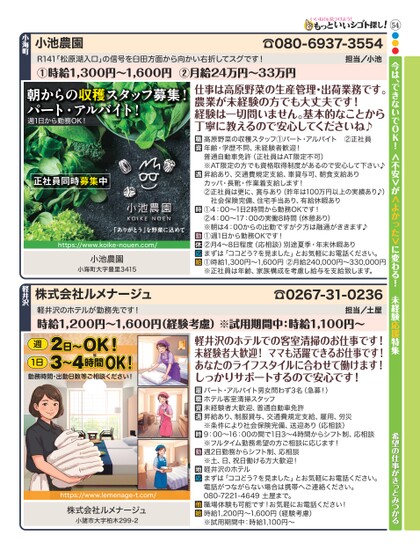 54●●●今は、できないでOK!<不安>が<よかった>に変わる!未経験応援特集☎080-6937-3554担当/小池小池農園小海町R141「松原湖入口」の信号を臼田方面から向かい右折してスグです!①時給1,300円〜1,600円②月給24万円〜33万円朝からの収穫スタッフ募集!パート・アルバイト!週1日から勤務OK!正社員同時募集中「ありがとう」を野菜に込めてhttps://www.koike-nouen.com/小池農園小海町大字豊里3415仕事は高原野菜の生産管理・出荷業務です。農業が未経験の方でも大丈夫です!経験は一切問いません。基本的なことから丁寧に教えるので安心してくださいね♪高原野菜の収穫スタッフ①パート・アルバイト②正社員年齢・学歴不問、未経験者歓迎!普通自動車免許(正社員はAT限定不可)※AT限定の方でも資格取得制度があるので安心して下さい♪昇給あり、交通費規定支給、車貸与可、朝食支給ありカッパ・長靴・作業着支給します!②正社員は更に、賞与あり(昨年は100万円以上の実績あり♪)社会保険完備、住宅手当あり、有給休暇あり①4:00〜1日2時間から勤務OKです!②4:00〜17:00の実働8時間(休憩あり)※朝は4:00からの出勤ですが夕方は融通がききます♪①週1日から勤務OKです!②月4〜8日程度(応相談)別途夏季・年末休暇ありまずは「ココどう?を見ました」とお気軽にお電話ください。①時給1,300円〜1,600円②月給240,000円〜330,000円※正社員は年齢、家族構成を考慮し給与を支給致します。軽井沢のホテルが勤務先です!時給1,200円〜1,600円(経験考慮)※試用期間中:時給1,100円〜担当/土屋週OK!日〜23〜4時間1日勤務時間・出勤日数等ご相談ください!OK!軽井沢のホテルでの客室清掃のお仕事です!未経験者大歓迎!ママも活躍できるお仕事です!あなたのライフスタイルに合わせて働けます!しっかりサポートするので安心です!☎0267-31-0236株式会社ルメナージュ軽井沢希望の仕事がきっとみつかるパート・アルバイト男女問わず3名(急募!)ホテル客室清掃スタッフ未経験者大歓迎、普通自動車免許昇給あり、制服貸与、交通費規定支給、雇用、労災※条件により社会保険完備、送迎あり(応相談)9:00〜16:00の間で1日3〜4時間からシフト制、応相談※フルタイム勤務希望の方ご相談に応じます!週2日勤務からシフト制、応相談※土、日、祝日働ける方大歓迎!軽井沢のホテルまずは「ココどう?を見ました」とお気軽にお電話ください。電話がつながらない場合は携帯へご連絡ください。080-7221-4649土屋まで。職場体験も可能です!お気軽にお電話ください!時給1,200円〜1,600円(経験考慮)※試用期間中:時給1,100円〜https://www.lemenage-t.com/株式会社ルメナージュ小諸市大字柏木299-2