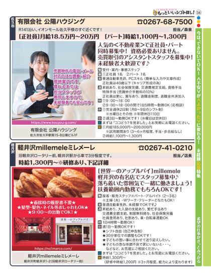 56●●●今は、できないでOK!<不安>が<よかった>に変わる!未経験応援特集☎0267-68-7500担当/森泉R141沿い、イオンモール佐久平様のすぐ近くです!有限会社公陽ハウジング佐久市[正社員]月給18.5万円〜20万円[パート]時給1,100円〜1,300円人気の<不動産業>で正社員・パート同時募集中!資格必要ありません。売買取引のアシスタントスタッフを募集中!未経験者大歓迎です♪受付・案内・事務スタッフ①正社員1名②パート1名普通自動車免許、PCスキル(簡単な入力や文章作成)正社員は40歳以下(キャリア形成の為)昇給あり、社会保険完備、交通費規定支給、資格手当特殊手当(売買仲介手数料の10%)正社員は更に、賞与あり、退職金制度、退職金共済加入①9:00〜18:00②9:00〜18:00の間で1日5時間〜勤務OK(応相談)①完全週休2日制(月8〜9日のシフト制)※水曜日とその他※年間休日110日②週3日〜勤務OKです!(水曜日は定休日)まずは「ココどう?を見ました」とお気軽にお電話ください。①月給185,000円〜200,000円※試用期間あり(3〜6ヶ月程度、手当・歩合給なし)②時給1,100円〜1,300円売買物件の電話・メール対応のほか調査・紹介現地案内です。慣れるまでは担当スタッフが帯同しますので、未経験者でも安心です!https://www.kouyou-g.com/有限会社公陽ハウジング佐久市佐久平駅南15-8公陽ビル1F[世界一のアップルパイ]millemele軽井沢の有名店でスタッフ募集中♪落ち着いた雰囲気で一緒に働きましょう!扶養範囲内勤務でもちろんOKです!☎0267-41-0210担当/店長軽井沢millemeleミレメーレ旧軽井沢ロータリー前、軽井沢駅から車で3分程度です。時給1,300円〜※研修あり、下記詳細軽井沢希望の仕事がきっとみつかる接客・販売スタッフ※パート・アルバイト(2〜3名)※主婦(夫)・Wワーク・フリーターどなたもOK!普通自動車免許、未経験でOKです♪昇給あり、大入袋の支給あり、繁忙手当あり交通費全額支給、制服無料貸与、社会保険完備社員登用あり、社割あり、車・自転車通勤OK1日4時間〜勤務OK!週1日〜勤務OKです!★シフト自由(自己申告制)★30分単位での調整もOKです!★子どもの習い事に合わせて送り迎えしたい。★子どもの急な体調不良で家にいないと・・・。などなど、お気軽にご相談ください。まずは「ココどう?を見ました」とお気軽にお電話ください。時給1,300円〜(研修中時給1,200円※3ヶ月程度、能力により変わります)★面接時の履歴書不要★★髪型・髪色・ネイル等おしゃれもOK★★9:00〜の出勤でOK!★https://no1marco.com/軽井沢millemeleミレメーレ軽井沢町軽井沢1-2(旧軽井沢ロータリー前)