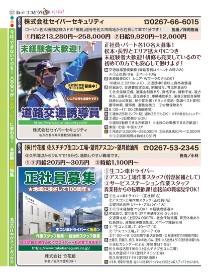 ローソン佐久横和店様カドの「横和」信号を佐久市街地から右折して車で1分です!①月給213,280円〜258,000円②日給9,920円〜12,000円担当/採用担当未経験者大歓迎!正社員10名パート10名募集中!シニアの方も活躍中です!道路交通誘導員https://www.saber-security.com/株式会社セイバーセキュリティ佐久市根々井字屋敷563番地1正社員・パート各10名大募集!松本・長野とエリア拡大中につき未経験者大歓迎!研修も充実しているので初めての方でも安心して働けます!交通誘導警備業務(雑踏警備はイベントの時のみ)※①正社員10名②パート10名未経験者OK!シニア・Wワークの方もOK!18歳以上(法令による)、交通誘導2級以上資格者優遇昇給あり、交通費規定支給、制服貸与、育児休業あり①社会保険完備、退職金制度あり、資格手当、精勤手当、遠方手当、出張手当、選任者手当、車輌補助手当、業務災害総合保険日焼け止め支給、熱中症対策(ドリンク支給・空調ベスト貸与)慶弔休暇、慶弔費、退職金積立②労働保険あり8:00〜17:00(実働8時間)①週休2日制(シフト制)週休3日でもOK!※その他会社カレンダー②週2〜3日勤務からOK!※週5日勤務できる方歓迎!※土日のみ勤務できる方歓迎!東信・北信・中信エリア①月給213,280円〜258,000円②日給9,920円〜12,000円※①②試用期間は時給1,061円☎0267-53-2345担当/小林(株)竹花組佐久チチブ生コン工場・望月アスコン・望月給油所佐久平周辺からクルマで15分位、通勤しやすい職場です。①②月給20万円〜30万円③時給1,100円〜佐久市☎0267-66-6015株式会社セイバーセキュリティ佐久市ねっ!ココどう?57●●●今は、できないでOK!<不安>が<よかった>に変わる!未経験応援特集①生コン車ドライバー②アスコン工場作業スタッフ(幹部候補として)③サービスステーション作業スタッフ異業種からの転職歓迎!面接前の職場見学OK!①生コン車ドライバー(正社員1名)②アスコン工場作業スタッフ(正社員1名)③望月給油所(パート・アルバイト1名)①②③未経験者でもOK!*経験者優遇*昇給あり、賞与あり(昨年実績年2回・2ヶ月分)交通費支給(上限24,000円)、社会保険完備、育児休業あり社員旅行、資格取得推奨制度、スポーツ施設利用①「生コン工場」7:40〜17:10②「アスコン工場」7:30〜17:00③7:00〜19:00の間で最大8時間(ご希望時間での勤務可能)土曜日、日曜日、祝日、年末年始、GW、夏季※入社時より10日有給休暇付与※当社カレンダーによる(年間休日110日)佐久市塩名田1166-1(佐久チチブ生コン工場)佐久市望月1119(望月アスコン工場)佐久市望月37-19(望月給油所)※冬季、時間外で除雪・塩カルの仕事をやっていただける方は収入アップさせられます。正社員募集★地域に根ざして100周年★生コン車ドライバー<急募>作業スタッフ募集!・給油所スタッフ募集ほぼ定時で帰れるのでプライベートも充実できます!https://www.takehanagumi.co.jp/株式会社竹花組本社/佐久市望月30-1希望の仕事がきっとみつかる