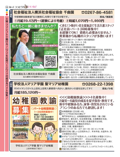 社会福祉法人横浜社会福祉協会千曲園☎0267-86-4581中部横断自動車道「佐久穂南IC」を降りて車で5分程です。①月給19.4万円〜(経験により考慮)②時給1,070円〜1,460円担当/施設長私たちと一緒に働きませんか?自分にも出来るだろうか?そんな不安を持っていても大丈夫。経験者もみんな最初は初心者です。パートさん!週2日〜勤務OK!こちらからもご応募できます★ご利用者様は、穏やかな方が多いです。★夜勤は慣れるまで先輩スタッフが一緒に業務に入ります♪https://yoko-fukushi.or.jp/社会福祉法人横浜社会福祉協会千曲園佐久穂町大字高野町1623-1<求む!>障がい者支援施設で生活介護スタッフ「正社員・パート」同時募集中!未経験でOK!資格も必要ありません♪異業種から転職のスタッフが多数います!生活介護スタッフ(障がい者支援施設)①正社員2名②パート3名高卒以上、普通自動車免許※①正社員は18歳以上(深夜勤務の為)昇給・賞与あり、社会保険完備、交通費規定支給、制服貸与①のみ、扶養手当、住宅手当、期末手当、資格手当夜勤手当(1回あたり6,000円)※経験を考慮し決定します。①「早番」7:15〜15:45「日勤」8:30〜17:00「遅番」10:00〜18:30「夜勤」16:30〜翌9:30(月4〜5回)※上記のシフト勤務です。②7:15〜18:30の間で1日3時間〜勤務OK(応相談)①週休2日制(シフト制、月9日)、特休5日(GW1日)(年末年始に4日)、リフレッシュ休暇連続3日間②週2日〜勤務OK!★週5日勤務も歓迎です!まずは「ココどう?を見ました」とお気軽にお電話ください。★小諸市・佐久市・小海町在籍の職員も多数勤務しています♪59ねっ!ココどう?佐久穂町●●●幼稚園教諭募集◎パート幼稚園教諭◎1〜3名同時募集中!時給1,100円〜8:30〜18:00の間で1日3〜5時間(応相談)https://www.stmaria.jp学校法人マリア学園聖マリア幼稚園上田市常田2丁目2-1<<<幼稚園教諭>>>4名募集中!2歳児〜6歳児の成長を促す保育・教育です。新卒や経験ある方、家事・育児をされているブランクのある方でも歓迎します!幼稚園教諭(正社員)4名キャリア形成の為40歳以下専門学校卒以上、幼稚園教諭免許(専修・1種・2種)昇給あり、賞与あり、社会保険完備、交通費規定支給、毎月調整手当支給、年末度に処遇改善手当支給、退職金制度あり、退職金共済加入育児、介護、看護休暇あり①8:15〜17:15②7:30〜16:30※シフト制週休2日制(嬉しい土日祝休み♪)、年末年始、お盆休み、他※年間休日126日まずは「ココどう?を見ました」とお気軽にお電話ください。メールからの応募もOK!shiawase@stmaria.jp丁寧なOJTがありますので、疑問や不安があればすぐに聞くことができる体制が整っています◎安心して仕事に慣れていけるよう、しっかりとフォローいたします。月給185,120円〜☎0268-22-1398担当/小松R141イオンスタイル上田を上田常入郵便局へ向かい、真向かいの道を左折してすぐ月給185,120円〜学校法人マリア学園聖マリア幼稚園上田市主婦・ママシフトで働ける!【ママを応援ページ】ママの就活&バイト特集!