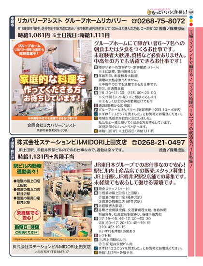 ●●●60主婦・ママシフトで働ける!【ママを応援ページ】ママの就活&バイト特集!R18東御市「田中」信号を田中駅方面に進み、田中駅前」信号を右折して100mほど進んだ左側、コーポ泉102担当/採用担当時給1,061円※土日祝日:時給1,111円☎0268-75-8072リカバリーアシストグループホームリカバリー東御市グループホームリカバリー田町(小諸市)も同時募集中!家庭的な料理を作ってくださる方お待ちしています!※中高年の方でも活躍できるお仕事です合同会社リカバリーアシスト東御市新張1265-308グループホームにて障がい者6〜7名への朝食または夕食をつくるお仕事です。未経験者大歓迎、資格など必要ありません。中高年の方でも活躍できるお仕事です!障がい者への食事作り・家事援助(パート)※主に調理、室内清掃など年齢不問、未経験者大歓迎調理の資格必要ありません。※中高年の方でも活躍できるお仕事です。労災、交通費支給①6:30〜11:30②15:00〜20:00※交代制(シフト制)※ご相談に応じます※①もしくは②のみの勤務だけでも可週2日勤務から応相談!グループホームリカバリー(東御市田中233-1コーポ泉内)まずは「ココどう?を見ました」とお気軽にお電話ください。地域生活援助を目的に設立しました。私たちと一緒に働いてくださる方お待ちしています。試用期間中にしっかりと学べます。時給1,061円※土日祝日:時給1,111円☎0268-21-0497担当/採用担当株式会社ステーションビルMIDORI上田支店JR上田駅、JR軽井沢駅ビル内でのお仕事なので、通勤は楽々です。時給1,131円+各種手当上田市・軽井沢駅ビル内勤務通勤楽々!●信濃の風上田店上田駅●信濃の風北口店軽井沢駅●信濃の風南口店軽井沢駅未経験でも安心!勤務日・時間ご相談ください!https://www.eki-midori.com/corporate/company/access.php株式会社ステーションビルMIDORI上田支店上田市天神1丁目1887-17JR東日本グループでのお仕事なので安心!駅ビル内土産品店での販売スタッフ募集!JR上田駅、JR軽井沢駅2店舗での募集です。未経験でも安心して働ける環境です。販売スタッフ(パート)①信濃の風上田店(上田駅)②信濃の風北口店(軽井沢駅)③信濃の風南口店(軽井沢駅)未経験者大歓迎!各種社会保険完備、交通費規程支給、有給休暇制服貸与、社員登用制度あり、各種手当支給①7:15〜15:45・12:00〜20:30②8:50〜17:20・10:45〜19:15③10:45〜19:15※いずれも休憩1時間ありシフト制①JR上田駅ビル内②③JR軽井沢駅ビル内まずは「ココどう?を見ました」とお気軽にお電話ください。時給1,131円+各種手当