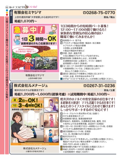 有限会社ミヤジマ上田交通別所線「大学前駅」から徒歩5分です!時給1,070円〜☎0268-75-0770担当/尾山急募中!1日3時間〜OK副業希望の方もご応募頂けます!家族的な雰囲気の居心地の良い職場です!https://miyajima-inc.jp/有限会社ミヤジマ上田市本郷13991日3時間からの短時間パート募集!12:00〜17:00の間で働ける方!家族的な雰囲気の居心地の良い職場で働いてみませんか!短時間パート若干名プラスチック製品の検査・箱詰め・加工補助※プラスチック製品の誘導※目視による検査業務※製品の箱詰め作業など学歴・免許・資格不問※加工機械のプログラミングはありません雇用保険(労働条件による)、労災保険交通費規定支給(上限あり)、マイカー通勤可試用期間1ヶ月あり(同条件)12:00〜17:00の間で1日3時間から働ける方!※就業時間については、ご相談に応じます!安心してご連絡ください。週5日(週5日以下の勤務もご相談に応じます!)※GW、お盆、年末年始はお休みですまずは「ココどう?を見ました」とお気軽にお電話ください。株式会社ルメナージュ☎0267-31-0236軽井沢のホテルが勤務先です!時給1,200円〜1,600円(経験考慮)※試用期間中:時給1,100円〜担当/土屋61ねっ!ココどう?上田市●●●主婦・ママシフトで働ける!【ママを応援ページ】ママの就活&バイト特集軽井沢!週OK!日〜23〜4時間1日勤務時間・出勤日数等ご相談ください!OK!https://www.lemenage-t.com/株式会社ルメナージュ小諸市大字柏木299-2軽井沢のホテルでの客室清掃のお仕事です!未経験者大歓迎!ママも活躍できるお仕事です!あなたのライフスタイルに合わせて働けます!しっかりサポートするので安心です!パート・アルバイト男女問わず3名(急募!)ホテル客室清掃スタッフ未経験者大歓迎、普通自動車免許昇給あり、制服貸与、交通費規定支給、雇用、労災※条件により社会保険完備、送迎あり(応相談)9:00〜16:00の間で1日3〜4時間からシフト制、応相談※フルタイム勤務希望の方ご相談に応じます!週2日勤務からシフト制、応相談※土、日、祝日働ける方大歓迎!軽井沢のホテルまずは「ココどう?を見ました」とお気軽にお電話ください。電話がつながらない場合は携帯へご連絡ください。080-7221-4649土屋まで。職場体験も可能です!お気軽にお電話ください!時給1,200円〜1,600円(経験考慮)※試用期間中:時給1,100円〜