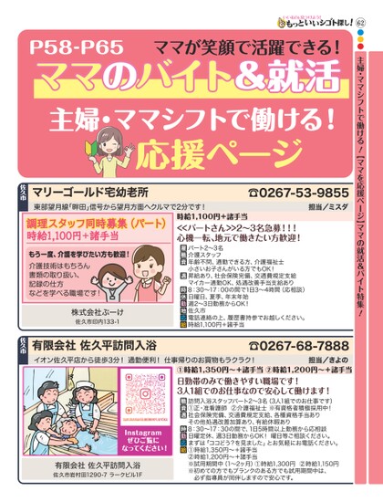 ●●●62主婦・ママシフトで働ける!【ママを応援ページ】ママの就活&バイト特集!P58-P65ママが笑顔で活躍できる!ママのバイト&就活主婦・ママシフトで働ける!応援ページ☎0267-53-9855担当/ミスダ東部望月線「畔田」信号から望月方面へクルマで2分です!マリーゴールド宅幼老所佐久市調理スタッフ同時募集(パート)時給1,100円+諸手当もう一度、介護を学びたい方も歓迎!介護技術はもちろん書類の取り扱い、記録の仕方などを学べる職場です!株式会社ぶーけ佐久市印内133-1時給1,100円+諸手当<<パートさん>>2〜3名急募!!!心機一転、地元で働きたい方歓迎!パート2〜3名介護スタッフ年齢不問、通勤できる方、介護福祉士小さいお子さんがいる方でもOK!昇給あり、社会保険完備、交通費規定支給マイカー通勤OK、処遇改善手当支給あり8:30〜17:00の間で1日3〜4時間(応相談)日曜日、夏季、年末年始週2〜3日勤務からOK!佐久市電話連絡の上、履歴書持参でお越しください。時給1,100円+諸手当☎0267-68-7888担当/きよの①時給1,350円〜+諸手当②時給1,200円〜+諸手当日勤帯のみで働きやすい職場です!3人1組でのお仕事なので安心して働けます!イオン佐久平店から徒歩3分!通勤便利!仕事帰りのお買物もラクラク!有限会社佐久平訪問入浴佐久市Instagramぜひご覧になってください!有限会社佐久平訪問入浴佐久市岩村田1290-7ラークビル1F訪問入浴スタッフパート2〜3名(3人1組でのお仕事です)①正・准看護師②介護福祉士※有資格者積極採用中!社会保険完備、交通費規定支給、各種資格手当ありその他処遇改善加算あり、有給休暇あり8:30〜17:30の間で、1日5時間以上勤務から応相談日曜定休、週3日勤務からOK!曜日等ご相談ください。まずは「ココどう?を見ました」とお気軽にお電話ください。①時給1,350円〜+諸手当②時給1,200円〜+諸手当※試用期間中(1〜2ヶ月)①時給1,300円②時給1,150円※初めての方でもブランクのある方でも試用期間中は、必ず指導員が同伴しますので安心です。