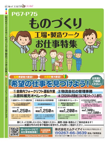 ねっ!ココどう?P67-P75ものづくり工場・製造ワークお仕事特集お気軽にご相談ください!転職希望者大歓迎!未経験者大歓迎!希望の仕事を見つけよう!①倉庫内フォークリフト運転作業③原料補充オペレーター②物流会社の管理事務④【2026年4月開始】ゴルフ場スタッフ(入寮可)①倉庫内フォークリフト運転作業②物流会社の管理事務③原料補充オペレーターフォークリフト免許あれば尚可正社員登用制度あり正社員登用制度あり上田市・派遣時給1,250円上田市・派遣時給1,250円原料は1袋25㎏あり台車で運びます。佐久市・派遣時給1,200円時間/7:20〜16:30実働7時間50分休日/日・祝+その他(週休2日制)交通費規定支給時間/7:20〜16:30実働7時間50分休日/日・祝+その他(週休2日制)交通費規定支給時間/8:30〜17:20実働8時間休日/土・日・祝休み交通費規定支給④【2026年4月開始】ゴルフ場スタッフ(入寮可)スタート・フロントレストランサービスなど軽井沢町・パート時給1,300円〜時給1,500円時間/6:00〜18:00の間で実働8時間休日/シフト制(週休2日)交通費規定支給寮に入って仕事したい方もご相談ください。調理・清掃・事務などご案内出来ます!掲載以外のお仕事や職種を希望の方、お気軽にご相談ください。ホームページにてお仕事情報掲載!受付中!https://www.mti-jp.com/24時間登録株式会社エムテイアイ佐久市佐久平駅北26-3☎0267-66-3639厚生労働大臣許可●派遣:派20-110003/紹介:20-ユ-110002担当/採用担当67●●●時代をリードする!ものづくり工場・製造ワーク求人特集!おうちでココどう!https://cocodou.info