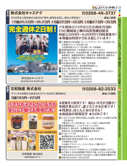 74●●●時代をリードする担当/長澤R143号を上田市街から約15分「青木」信号を左折し、青木小学校近く①月給20.5万円〜36.2万円②月給22万円〜35万円③月給27万円〜35万円完全週休2日制!<年間休日>120日(完全週休2日制)CNC機械加工機の高度熟練技能者時給3,500円〜6,000円で同時募集中!★物価高特別手当を支給しています♪☎0268-49-3737株式会社キャステク青木村!ものづくり工場・製造ワーク求人特集!おうちでココどう!https://cocodou.info未経験からのスタートが多く活躍!資格取得から先輩社員のサポートが安心!ぜひ、工場見学にお越しください!https://www.castec.co.jp/株式会社キャステク【本社】青木村大字夫神1282①機械加工NC旋盤、マシニングオペレーター(正社員)2名②営業スタッフ(正社員)2名③品質管理スタッフ(正社員)1名※経験者普通自動車免許※未経験からのスタートでOK!昇給・賞与あり、社会保険完備、交通費全額支給、物価高手当制服貸与、退職金制度あり、資格手当、皆勤手当、精勤手当家族手当、役職手当、時間外勤務手当、有給休暇あり8:00〜17:00完全週休2日制、GW、お盆、年末年始※年間休日120日有給取得率8割以上本社工場(青木村大字夫神1282)まずは「ココどう?を見ました」とお気軽にお電話ください。ぜひ、工場見学にお越しください!①月給205,000円〜362,000円②月給220,000円〜350,000円③月給270,000円〜350,000円☎0268-82-2533担当/久保田交和物産株式会社テクノさかき駅から徒歩5分(テクノさかき工業団地内)月給18万円〜22万円坂城町小さなお子さんがいる方も安心して働ける環境です♪ホームページもご覧ください交和物産株式会社坂城町南条5181-3未経験者大歓迎です♪幅広い年代が活躍中!単純作業なので、誰でもできる仕事です!★残業は、ほとんどありません!★面接前の現場見学★もOKです!①きのこや山菜・果実の目視による選別、袋やビンに充填する作業正社員3名②配送センター正社員1名※シール貼り、箱詰め作業未経験者歓迎!しっかりサポートします!昇給あり、賞与あり、交通費規定支給、制服貸与家族手当、社会保険完備、退職金共済あり8:00〜17:00★残業はほとんどありません!週休2日制(祝日は出勤)GW、お盆、年末年始※年間休日113日※仕事とプライべート、メリハリをもって働けます!坂城町南条5181-3まずは「ココどう?を見ました」とお気軽にお電話ください。お子様がいる方は保育園や学校の行事、お子さんの急な体調不良のお休みにも対応できる安心して働ける環境の職場です。月給180,000円〜220,000円