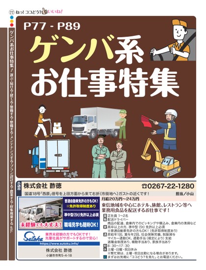 ねっ!ココどう?P77-P89ゲンバ系お仕事特集普通自動車免許の方もOK!※免許取得制度あり準中型(5t)免許以上必須未経験でも大丈夫!職場見学も随時OK!業界未経験の方でもOKです!先輩社員がサポートするので安心!https://www.sutoku.info/株式会社酢徳小諸市市町5-4-18月給20万円〜24万円東信地域を中心にホテル、旅館、レストラン等へ業務用食品を配送するお仕事です!正社員1〜2名配送ドライバー商品の配達、倉庫内でのピッキングや積込み、倉庫内の清掃など高卒以上の方、準中型(5t)免許以上必須※普通自動車免許の方もOK!(免許取得制度あり)昇給年1回、賞与年2回、社会保険完備、制服貸与マイカー通勤OK、通勤手当(規定により)支給退職金制度あり、精勤手当あり、家族手当あり8:30〜17:30土曜・日曜・祝日休み※繁忙期は、土曜・祝日出勤になる場合があります。まずはお気軽に「ココどう?を見た」とお電話ください。☎0267-22-1280担当/小山国道18号「西原」信号を上田方面から来て右折(市街地へ)ガストの近くです!株式会社酢徳小諸市77●●●ゲンバ系お仕事特集!運ぶ・届ける・建てる・警備する・整備する・メンテナンスする・プラン設計する・農業する・収集廃棄するetc.