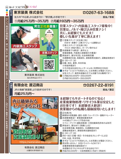 ☎0267-63-1688担当/有坂東京装美株式会社佐久市ねっ!ココどう?営業スタッフ・内装施工スタッフ募集中!営業は、ノルマ・飛び込み営業ナシ!共に、未経験でも大丈夫!優しい先輩が丁寧に教えます!①営業スタッフ(正社員2名)打合せ・見積り・工事スケジュール調整など②施エスタッフ(正社員2名)クロス・床貼り施工、カーテン取付など未経験者でも歓迎!高卒以上営業経験者、内装施工経験者の方優遇!昇給あり、賞与年2回、社会保険完備交通費規定支給、制服貸与、資格取得支援あり、退職金制度あり8:00〜17:30日曜、祝日、夏季、年末年始※有給休暇あり※その他当社会社カレンターによる(年間休日105日)まずは「ココどう?を見ました」とお気軽にお電話ください。女性スタッフ・業界未経験の方でも活躍できる職場です!①月給250,000円〜350,000円②月給190,000円〜350,000円☎0267-22-8191担当/渡辺未経験でもサポートするので安心!産業廃棄物処理・リサイクル業は安定したお仕事です!未経験者大歓迎!異業種からの転職も積極採用いたします!正社員2名廃棄物の収集運搬・選別・処理・フォークリフト・重機オペレーター未経験者歓迎!要普通自動車免許※45歳以下(キャリア形成の為)※フォークリフト運転技能者・大型自動車免許あれば尚可昇給あり、賞与あり(実績による)社会保険完備、制服貸与、交通費規定支給退職金制度あり、資格取得支援制度あり8:00〜17:00月6〜8日(日曜・祝日・その他会社カレンダーによる)GW、お盆、年末年始まずは「ココどう?を見ました」とお気軽にお電話ください。男女問いません!女性ドライバーもOKです!各種資格取得支援制度あり!未経験の方でもスキルUPできる会社です!月給250,000円〜※試用期間3ヶ月あり(同条件)男女正社員募集!内装施工スタッフ営業スタッフホームページもご覧ください東京装美株式会社佐久市中込3-17-1有限会社渡辺商店JR小海線「美里駅」より徒歩10分です!月給25万円〜小諸市再び価値あるモノにする会社資格取得支援制度あり!https://watanabe-biz.co.jp/有限会社渡辺商店小諸市大字市891-6佐久市「中込駅」から徒歩7分!「野沢橋」の手前です!①月給25万円〜35万円②月給19万円〜35万円81●●●ゲンバ系お仕事特集!運ぶ・届ける・建てる・警備する・整備する・メンテナンスする・プラン設計する・農業する・収集廃棄するetc.