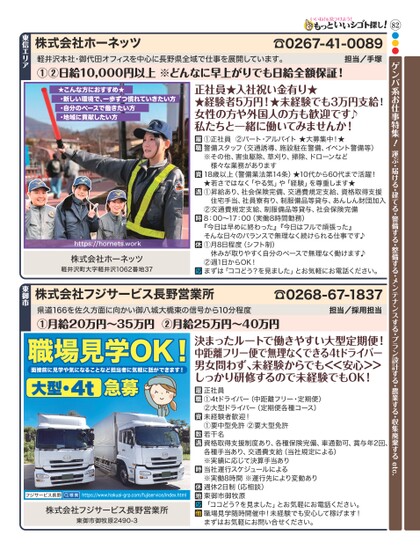82●●●ゲンバ系お仕事特集!運ぶ・届ける・建てる・警備する・整備する・メンテナンスする・プラン設計する・農業する・収集廃棄するetc.職場見学OK!面接前に見学や気になることなど担当者に気軽に話ができます!大型・4t急募フジサービス長野https://www.hakuai-grp.com/fujiservice/index.html株式会社フジサービス長野営業所東御市御牧原2490-3決まったルートで働きやすい大型定期便!中距離フリー便で無理なくできる4tドライバー男女問わず、未経験からでも<<安心>>しっかり研修するので未経験でもOK!正社員①4tドライバー(中距離フリー・定期便)②大型ドライバー(定期便各種コース)未経験者歓迎!①要中型免許②要大型免許若干名資格取得支援制度あり、各種保険完備、車通勤可、賞与年2回、各種手当あり、交通費支給(当社規定による)※実績に応じて決算手当あり当社運行スケジュールによる※実働8時間※運行先により変動あり週休2日制(応相談)東御市御牧原「ココどう?を見ました」とお気軽にお電話ください。職場見学随時開催中!未経験でも安心して稼げます!まずはお気軽にお問い合せください。株式会社ホーネッツ☎0267-41-0089軽井沢本社・御代田オフィスを中心に長野県全域で仕事を展開しています。①②日給10,000円以上※どんなに早上がりでも日給全額保証!担当/手塚★こんな方におすすめ★・新しい環境で、一歩ずつ慣れていきたい方・自分のペースで働きたい方・地域に貢献したい方正社員★入社祝い金有り★★経験者5万円!★未経験でも3万円支給!女性の方や外国人の方も歓迎です♪私たちと一緒に働いてみませんか!①正社員②パート・アルバイト★大募集中!★警備スタッフ(交通誘導、施設駐在警備、イベント警備等)※その他、害虫駆除、草刈り、掃除、ドローンなど様々な業務があります18歳以上(警備業法第14条)★10代から60代まで活躍!★若さではなく「やる気」や「経験」を尊重します★①昇給あり、社会保険完備、交通費規定支給、資格取得支援住宅手当、社員寮有り、制服備品等貸与、あんしん財団加入②交通費規定支給、制服備品等貸与、社会保険完備8:00〜17:00(実働8時間勤務)『今日は早めに終わった』『今日はフルで頑張った』そんな日々のバランスで無理なく続けられる仕事です♪①月8日程度(シフト制)休みが取りやすく自分のペースで無理なく働けます♪②週1日からOK!まずは「ココどう?を見ました」とお気軽にお電話ください。https://hornets.work株式会社ホーネッツ軽井沢町大字軽井沢1062番地37株式会社フジサービス長野営業所県道166を佐久方面に向かい御八城大橋東の信号から10分程度①月給20万円〜35万円②月給25万円〜40万円☎0268-67-1837担当/採用担当東信エリア東御市