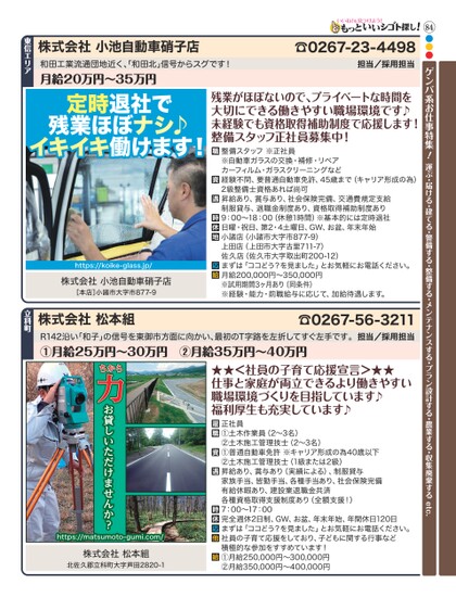 84●●●ゲンバ系お仕事特集!運ぶ・届ける・建てる・警備する・整備する・メンテナンスする・プラン設計する・農業する・収集廃棄するetc.定時退社で残業ほぼナシ♪イキイキ働けます!https://koike-glass.jp/株式会社小池自動車硝子店[本店]小諸市大字市877-9残業がほぼないので、プライベートな時間を大切にできる働きやすい職場環境です♪未経験でも資格取得補助制度で応援します!整備スタッフ正社員募集中!整備スタッフ※正社員※自動車ガラスの交換・補修・リペアカーフィルム・ガラスクリーニングなど経験不問、要普通自動車免許、45歳まで(キャリア形成の為)2級整備士資格あれば尚可昇給あり、賞与あり、社会保険完備、交通費規定支給制服貸与、退職金制度あり、資格取得補助制度あり9:00〜18:00(休憩1時間)※基本的には定時退社日曜・祝日、第2・4土曜日、GW、お盆、年末年始小諸店(小諸市大字市877-9)上田店(上田市大字古里711-7)佐久店(佐久市大字取出町200-12)まずは「ココどう?を見ました」とお気軽にお電話ください。月給200,000円〜350,000円※試用期間3ヶ月あり(同条件)※経験・能力・前職給与に応じて、加給待遇します。☎0267-23-4498担当/採用担当株式会社小池自動車硝子店和田工業流通団地近く、和田北」信号からスグです!月給20万円〜35万円東信エリア★★<社員の子育て応援宣言>★★仕事と家庭が両立できるより働きやすい職場環境づくりを目指しています♪福利厚生も充実しています♪正社員①土木作業員(2〜3名)②土木施工管理技士(2〜3名)①普通自動車免許※キャリア形成の為40歳以下②土木施工管理技士(1級または2級)昇給あり、賞与あり(実績による)、制服貸与家族手当、皆勤手当、各種手当あり、社会保険完備有給休暇あり、建設業退職金共済各種資格取得支援制度あり(全額支援!)7:00〜17:00完全週休2日制、GW、お盆、年末年始、年間休日120日まずは「ココどう?を見ました」とお気軽にお電話ください。社員の子育て応援をしており、子どもに関する行事など積極的な参加をすすめています!①月給250,000円〜300,000円②月給350,000円〜400,000円から力ちお貸しいただけませんか?https://matsumoto-gumi.com/株式会社松本組北佐久郡立科町大字田2820-1R142沿い「和子」の信号を東御市方面に向かい、最初のT字路を左折してすぐ左手です。担当/採用担当①月給25万円〜30万円②月給35万円〜40万円☎0267-56-3211株式会社松本組立科町