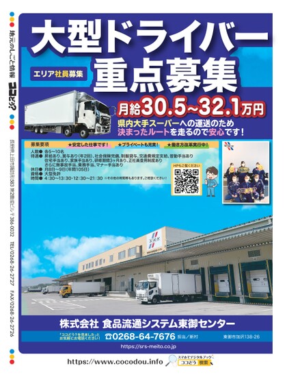 大型ドライバー重点募集エリア社員募集月給30.5〜32.1万円県内大手スーパーへの運送のため決まったルートを走るので安心です!募集要項人数●待遇●休日●資格●時間●★安定した仕事です!★プライベートも充実!★働き方改革実行中!各5〜10名昇給あり、賞与あり(年2回)、社会保険完備、制服貸与、交通費規定支給、皆勤手当あり住宅手当あり、家族手当あり、研修期間3ヶ月あり、正社員登用制度ありさらに無事故手当、乗務手当、マナー手当あり月8日〜9日(年間105日)大型免許4:30〜13:30・12:30〜21:30※その他の時間帯もあります。ご相談ください!HPもご覧ください株式会社食品流通システム東御センター担当/新村東御市加沢138-26「ココどう?を見ました」とお気軽にお電話ください!☎0268-64-7676https://srs-meito.co.jphttps://www.cocodou.infoスマホでデジタルブック●●●●●●●●●