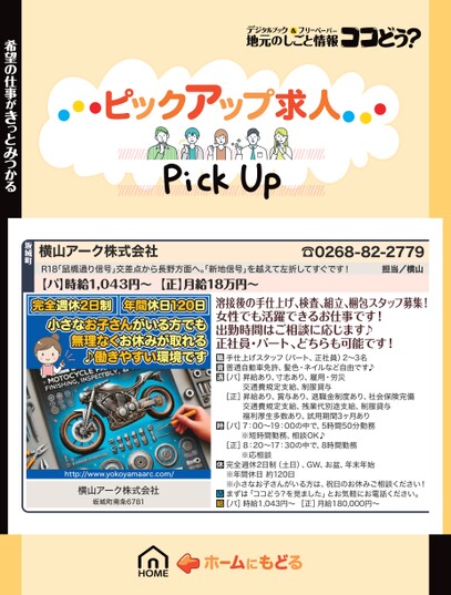 横山アーク株式会社☎0268-82-2779R18「鼠橋通り信号」交差点から長野方面へ。新地信号」を越えて左折してすぐです!担当/横山【パ】時給1,043円〜【正】月給18万円〜完全週休2日制年間休日120日小さなお子さんがいる方でもで無理なくお休みが取れる♪働きやすい環境です溶接後の手仕上げ、検査、組立、梱包スタッフ募集!女性でも活躍できるお仕事です!出勤時間はご相談に応じます♪正社員・パート、どちらも可能です!手仕上げスタッフ(パート、正社員)2〜3名普通自動車免許、髪色・ネイルなど自由です♪[パ]昇給あり、寸志あり、雇用・労災交通費規定支給、制服貸与[正]昇給あり、賞与あり、退職金制度あり、社会保険完備交通費規定支給、残業代別途支給、制服貸与福利厚生多数あり、試用期間3ヶ月あり[パ]7:00〜19:00の中で、5時間50分勤務※短時間勤務、相談OK♪[正]8:20〜17:30の中で、8時間勤務※応相談完全週休2日制(土日)、GW、お盆、年末年始※年間休日約120日※小さなお子さんがいる方は、祝日のお休みご相談ください!まずは「ココどう?を見ました」とお気軽にお電話ください。[パ]時給1,043円〜[正]月給180,000円〜http://www.yokoyamaarc.com/横山アーク株式会社坂城町南条6781希望の仕事がきっとみつかる坂城町