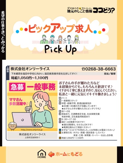 急募一般事務お子さんの手が離れた方など未経験からでも、もちろん大歓迎です♪イチから丁寧に教えますので、安心してください。私達と一緒に元気にイキイキ働きましょう♪☎0268-38-6663担当/飯塚株式会社オンリーライス下本郷西を塩田中学校に向かい、塩田家具様手前を左折してすぐ!時給1,050円〜1,100円上田市ママさん多数活躍中♪http://www.onlyrice.jp株式会社オンリーライス上田市五加969-1パート一般事務スタッフ学歴・経験不問、普通自動車免許★40歳〜60歳の方が活躍しています!★お子さんの手が離れた方にピッタリです♪各1〜2名昇給あり、交通費規定支給、社会保険完備有給休暇、正社員登用制度あり9:00〜17:00週3〜4日勤務でOKです!★週5日勤務も、もちろんOKです!★勤務日数などご相談ください!まずは「ココどう?を見ました」とお気軽にお電話ください♪主要取引先:ホテル・旅館・国民宿舎・レストラン食堂・工場・保育園・スーパー・仕出し店多数時給1,050円〜1,100円希望の仕事がきっとみつかる