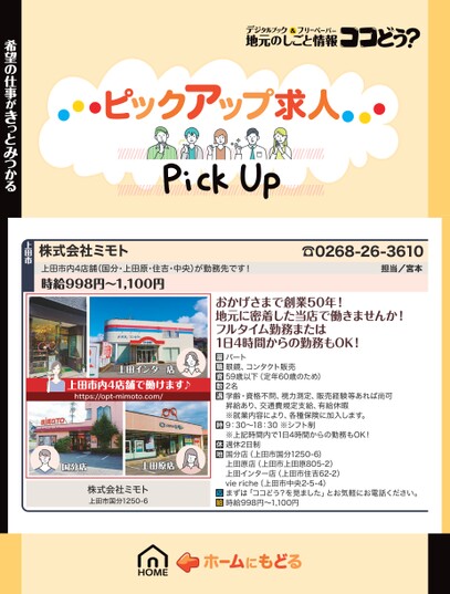 おかげさまで創業50年!地元に密着した当店で働きませんか!フルタイム勤務または1日4時間からの勤務もOK!パート眼鏡、コンタクト販売59歳以下(定年60歳のため)2名学齢・資格不問、視力測定、販売経験等あれば尚可昇給あり、交通費規定支給、有給休暇※就業内容により、各種保険に加入します。9:30〜18:30※シフト制※上記時間内で1日4時間からの勤務もOK!週休2日制国分店(上田市国分1250-6)上田原店(上田市上田原805-2)上田インター店(上田市住吉62-2)vieriche(上田市中央2-5-4)まずは「ココどう?を見ました」とお気軽にお電話ください。時給998円〜1,100円上田インター店上田市内4店舗で働けます♪https://opt-mimoto.com/国分店上田原店株式会社ミモト上田市国分1250-6☎0268-26-3610担当/宮本株式会社ミモト上田市内4店舗(国分・上田原・住吉・中央)が勤務先です!時給998円〜1,100円上田市希望の仕事がきっとみつかる