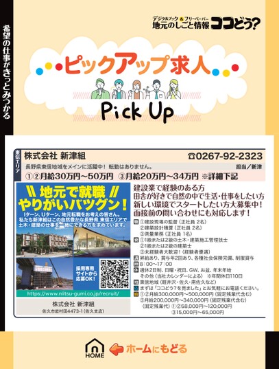 株式会社新津組☎0267-92-2323長野県東信地域をメインに活躍中!転勤はありません。①②月給30万円〜50万円③月給20万円〜34万円※詳細下記担当/新津希望の仕事がきっとみつかる東信エリア地元で就職やりがいバツグン!Iターン、Uターン、地元転職をお考えの皆さん。私たち新津組はこの自然豊かな長野県東信エリアで土木・建築の仕事を一緒にできる方を求めています。い採用専用サイトから応募OK!https://www.niitsu-gumi.co.jp/recruit/株式会社新津組佐久市岩村田4473-1(佐久支店)建設業で経験のある方田舎が好きで自然の中で生活・仕事をしたい方新しい環境でスタートしたい方大募集中!面接前の問い合わせにも対応します!①建設現場の監督(正社員2名)②建築設計積算(正社員2名)③測量業務(正社員1名)①1級または2級の土木・建築施工管理技士②1級または2級の建築士③未経験者大歓迎!(経験者優遇)昇給あり、賞与年2回あり、各種社会保険完備、制服貸与8:00〜17:00週休2日制、日曜・祝日、GW、お盆、年末年始その他(当社カレンダーによる)※年間休日110日東信地域(軽井沢・佐久・南佐久など)まずは「ココどう?を見ました」とお気軽にお電話ください。①②月給300,000円〜500,000円(固定残業代含む)③月給200,000円〜340,000円(固定残業代含む)(固定残業代)①②58,000円〜120,000円③15,000円〜65,000円
