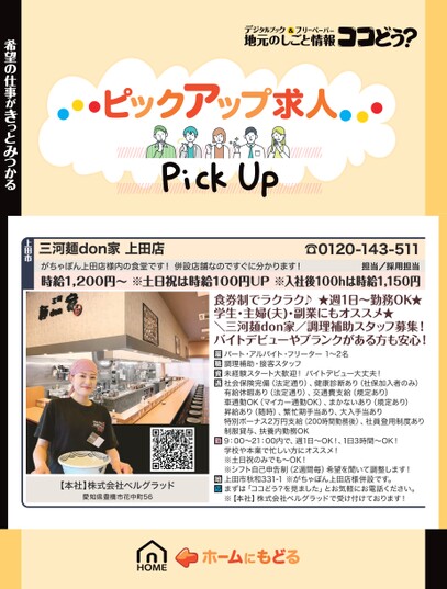 三河麺don家上田店☎0120-143-511担当/採用担当がちゃぽん上田店様内の食堂です!併設店舗なのですぐに分かります!時給1,200円〜※土日祝は時給100円UP※入社後100hは時給1,150円食券制でラクラク♪★週1日〜勤務OK★学生・主婦(夫)・副業にもオススメ★\三河麺don家/調理補助スタッフ募集!バイトデビューやブランクがある方も安心!パート・アルバイト・フリーター1〜2名調理補助・接客スタッフ未経験スタート大歓迎!バイトデビュー大丈夫!社会保険完備(法定通り)、健康診断あり(社保加入者のみ)有給休暇あり(法定通り)、交通費支給(規定あり)車通勤OK(マイカー通勤OK)、まかないあり(規定あり)昇給あり(随時)、繁忙期手当あり、大入手当あり特別ボーナス2万円支給(200時間勤務後)、社員登用制度あり制服貸与、扶養内勤務OK9:00〜21:00内で、週1日〜OK!、1日3時間〜OK!学校や本業で忙しい方にオススメ!※土日祝のみでも〜OK!※シフト自己申告制(2週間毎)希望を聞いて調整します!上田市秋和331-1※がちゃぽん上田店様併設です。まずは「ココどう?を見ました」とお気軽にお電話ください。※【本社】株式会社ベルグラッドで受け付けております!【本社】株式会社ベルグラッド愛知県豊橋市花中町56希望の仕事がきっとみつかる上田市