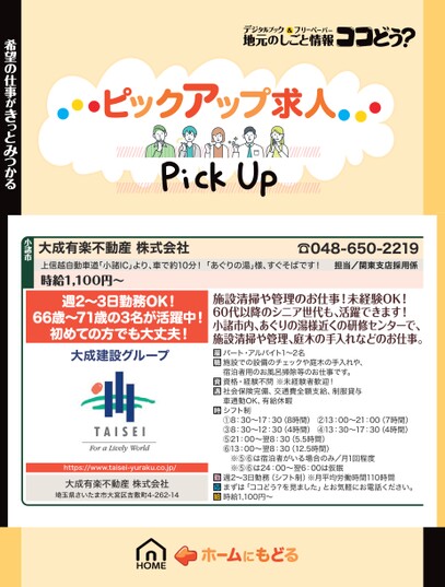 大成有楽不動産株式会社上信越自動車道「小諸IC」より、車で約10分!「あぐりの湯」様、すぐそばです!時給1,100円〜☎048-650-2219担当/関東支店採用係希望の仕事がきっとみつかる小諸市週2〜3日勤務OK!66歳〜71歳の3名が活躍中!初めての方でも大丈夫!大成建設グループhttps://www.taisei-yuraku.co.jp/大成有楽不動産株式会社埼玉県さいたま市大宮区吉敷町4-262-14施設清掃や管理のお仕事!未経験OK!60代以降のシニア世代も、活躍できます!小諸市内、あぐりの湯様近くの研修センターで、施設清掃や管理、庭木の手入れなどのお仕事。パート・アルバイト1〜2名施設での設備のチェックや庭木の手入れや、宿泊者用のお風呂掃除等のお仕事です。資格・経験不問※未経験者歓迎!社会保険完備、交通費全額支給、制服貸与車通勤OK、有給休暇シフト制①8:30〜17:30(8時間)②13:00〜21:00(7時間)③8:30〜12:30(4時間)④13:30〜17:30(4時間)⑤21:00〜翌8:30(5.5時間)⑥13:00〜翌8:30(12.5時間)※⑤⑥は宿泊者がいる場合のみ/月1回程度※⑤⑥は24:00〜翌6:00は仮眠週2〜3日勤務(シフト制)※月平均労働時間110時間まずは「ココどう?を見ました」とお気軽にお電話ください。時給1,100円〜
