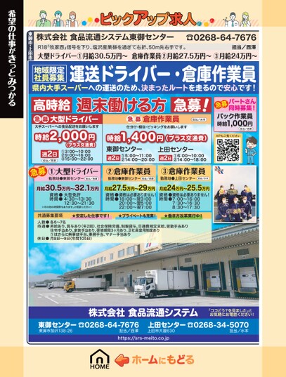 急募パック作業員時給円1,000担当/西澤HPもご覧ください株式会社食品流通システム東御センター☎0268-64-7676担当/西澤R18「牧家西」信号を下り、塩沢産業様を過ぎて右折、50m先右手です。大型ドライバー①月給30.5万円〜倉庫作業員②月給27.5万円〜③月給24万円〜地域限定社員募集県内大手スーパーへの運送のため、決まったルートを走るので安心です!パートさん同時募集!運送ドライバー・倉庫作業員週末働ける方急募!高時給東御市・上田市急募大型ドライバー大手スーパーへの食品配送をお願いします時給2,000円(プラス交通費)週2日担当/西澤①3:00〜10:00②9:00〜16:00③15:00〜22:00急募①大型ドライバー勤務地●東御センター担当/西澤急募倉庫作業員仕分け・梱包・ピッキングをお願いします担当/水本時給1,400円(プラス交通費)東御センター週2日②倉庫作業員①5:00〜11:00②14:00〜20:00上田センター週2日③倉庫作業員①6:00〜10:00②14:00〜18:00勤務地●東御センター担当/西澤勤務地●上田センター担当/水本月給30.5万円〜32.1万円月給27.5万円〜29万円月給24万円〜25.5万円資格●時間●大型免許4:30〜13:3012:30〜21:30※その他の時間帯もあります。ご相談ください!資格●時間●資格は必要ありません!18:00〜翌3:0020:00〜翌5:0022:00〜翌7:00資格●時間●資格は必要ありません!7:00〜16:007:30〜16:308:30〜17:30共通募集要項人数●待遇●★安定した仕事です!★プライベートも充実!★働き方改革実行中!各6〜7名昇給あり、賞与あり(年2回)、社会保険完備、制服貸与、交通費規定支給、皆勤手当あり住宅手当あり、家族手当あり、研修期間3ヶ月あり、正社員登用制度あり①はさらに無事故手当、乗務手当、マナー手当あり月8日〜9日(年間105日)休日●東御センター東御市加沢138-26株式会社食品流通システム「ココどう?を見ました」とお気軽にお電話ください!☎0268-64-7676上田センター☎0268-34-5070担当/水本担当/西澤https://srs-meito.co.jp上田市大屋630希望の仕事がきっとみつかる