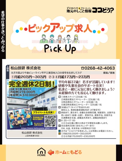 丸子方面より千曲ビューライン平戸工業団地入口の信号を右折してスグ①月給20万円〜30万円②③④月給17万円〜23万円完全週休2日制!28歳・加工職・勤続2年[月収例]278,000円[年収例]4,510,000円プライベートも充実!平均年齢37歳!若手が活躍中!ホームページもご覧ください。https://www.matsuyama-giken.co.jp/松山技研株式会社上田市長瀬1050平均年齢37歳!若手が活躍しています!研修や先輩社員のサポート充実!私達と一緒に元気に楽しく働きましょう♪未経験の方でも安心して働けます。①営業スタッフ(正社員)1名②表面処理加工オペレーター(正社員)1名③熱処理加工オペレーター(正社員)1名④真空熱処理加工オペレーター(正社員)1名36歳以下(キャリア形成のため)高校以上、普通自動車運転免許(AT限定可)昇給あり、賞与あり、各種社会保険完備、制服貸与、出張手当祝い金あり(結婚・出産)、家族手当、資格手当、技能手当交通費規定支給、退職金共済あり、退職金制度あり8:20〜17:00※②③は仕事に慣れた時点で交替制をお願いします。完全週休2日制(会社カレンダーあり)GW、お盆、年末年始※年間休日115日まずは「ココどう?を見ました」とお気軽にお電話ください。①月給200,000円〜300,000円②③④月給170,000円〜230,000円希望の仕事がきっとみつかる上田市松山技研株式会社☎0268-42-4063担当/吉池