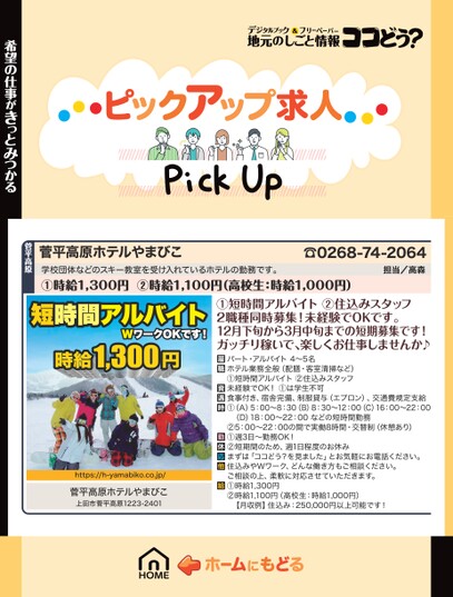 学校団体などのスキー教室を受け入れているホテルの勤務です。①時給1,300円②時給1,100円(高校生:時給1,000円)短時間アルバイトWワークOKです!①短時間アルバイト②住込みスタッフ2職種同時募集!未経験でOKです。12月下旬から3月中旬までの短期募集です!ガッチリ稼いで、楽しくお仕事しませんか♪パート・アルバイト4〜5名ホテル業務全般(配膳・客室清掃など)①短時間アルバイト②住込みスタッフ未経験でOK!①は学生不可食事付き、宿舎完備、制服貸与(エプロン)、交通費規定支給①(A)5:00〜8:30(B)8:30〜12:00(C)16:00〜22:00(D)18:00〜22:00などの短時間勤務②5:00〜22:00の間で実働8時間・交替制(休憩あり)①週3日〜勤務OK!②短期間のため、週1日程度のお休みまずは「ココどう?を見ました」とお気軽にお電話ください。住込みやWワーク、どんな働き方もご相談ください。ご相談の上、柔軟に対応させていただきます。①時給1,300円②時給1,100円(高校生:時給1,000円)【月収例】住込み:250,000円以上可能です!https://h-yamabiko.co.jp/菅平高原ホテルやまびこ上田市菅平高原1223-2401希望の仕事がきっとみつかる菅平高原菅平高原ホテルやまびこ☎0268-74-2064担当/高森