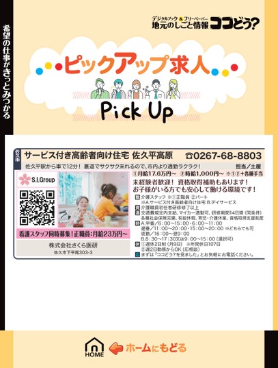 サービス付き高齢者向け住宅佐久平高原☎0267-68-8803佐久平駅から車で12分!裏道でサクサク来れるので、市内より通勤ラクラク!担当/土屋①月給17.6万円〜②時給1,000円〜※①②+各種手当未経験者歓迎!資格取得補助もあります!お子様がいる方でも安心して働ける環境です!希望の仕事がきっとみつかる佐久市看護スタッフ同時募集!正職員:月給23万円〜株式会社さくら医研佐久市下平尾303-3介護スタッフ※①正職員②パート※A.サービス付き高齢者向け住宅B.デイサービス介護職員初任者研修修了以上交通費規定内支給、マイカー通勤可、研修期間14日間(同条件)各種社会保険完備、有給休暇、育児・介護休業、資格取得支援制度A.早番/6:00〜15:00・6:00〜11:00遅番/11:00〜20:00・15:00〜20:00※どちらでも可夜勤/16:00〜翌9:00B.8:30〜17:30又は9:00〜15:00(選択可)①週休2日制(月9日)※年間休日107日②週2日勤務からOK(応相談)まずは「ココどう?を見ました」とお気軽にお電話ください。