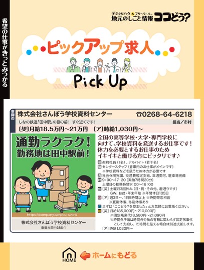株式会社さんぽう学校資料センターしなの鉄道「田中駅」の目の前!すぐ近くです!☎0268-64-6218担当/市村[契]月給18.5万円〜21万円[ア]時給1,030円〜通勤ラクラク!勤務地は田中駅前!全国の高等学校・大学・専門学校に向けて、学校資料を発送するお仕事です!体力を必要とするお仕事のためイキイキと働ける方にピッタリです♪契約社員(1名)、アルバイト(若干名)センタースタッフ(倉庫内のお仕事がメインです)※学校資料などを扱うため体力が必要です社会保険完備、交通費規定支給、車通勤可、駐車場完備9:00〜17:20(実働7時間20分)土曜日の勤務時間9:00〜16:00[契]土曜月3回休み(日・祝・その他、暦通りです)GW、お盆・年末年始※年間休日105日[ア]週3日〜、1日5時間以上※時間帯応相談※夏期休暇、冬期休暇ありまずは「ココどう?を見ました」とお気軽にお電話ください。[契]月給185,000円〜210,000円※固定残業代18,580円〜21,090円※時間外手当は時間外労働の有無に関わらず固定残業代として支給し、15時間を超える場合は別途支給します。[ア]時給1,030円〜https://company.sanpou-s.net/株式会社さんぽう学校資料センター東御市田中286-1希望の仕事がきっとみつかる東御市
