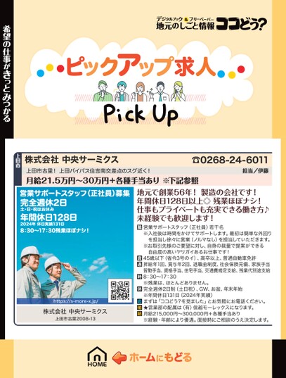 株式会社中央サーミクス上田市古里!上田バイパス住吉南交差点のスグ近く!月給21.5万円〜30万円+各種手当あり※下記参照☎0268-24-6011担当/伊藤希望の仕事がきっとみつかる上田市営業サポートスタッフ(正社員)募集完全週休2日年間休日128日土・日・祝はお休み2024年休日実績131日8:30〜17:30残業ほぼナシ!https://s-more-x.jp/株式会社中央サーミクス上田市古里2008-13地元で創業56年!製造の会社です!年間休日128日以上◎残業ほぼナシ!仕事もプライベートも充実できる働き方♪未経験でも歓迎します!営業サポートスタッフ(正社員)若干名※入社後は時間をかけてサポートします。最初は簡単な外回りを担当し徐々に営業(ノルマなし)を担当していただきます。※お取引先様のご要望に対し、自身の裁量で提案ができる自由度の高いヤリガイあるお仕事です!45歳以下(省令3号のイ)、高卒以上、普通自動車免許昇給年1回、賞与年2回、退職金制度、社会保険完備、家族手当皆勤手当、資格手当、住宅手当、交通費規定支給、残業代別途支給8:30〜17:30※残業は、ほとんどありません。完全週休2日制(土日祝)、GW、お盆、年末年始※年間休日131日(2024年実績)まずは「ココどう?を見ました」とお気軽にお電話ください。★営業部の配属は(有)信越モーレックスになります。月給215,000円〜300,000円+各種手当あり※経験・年齢により優遇。面接時にご相談のうえ決定します。
