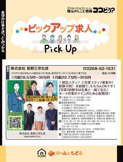 株式会社長野三洋化成カラオケまねきねこ小諸店近くの「赤岩」信号をサンラインに向かい車で2分①月給18.5万円〜30万円②月給22.7万円〜30万円☎0268-62-1631担当/小河原希望の仕事がきっとみつかる東御市①製造スタッフ②営業スタッフ募集中!経験不問!未経験で、もちろんOKです![営業]研修中は先輩と一緒で安心♪ルート営業がメインのため心配無用!先輩社員が丁寧に教えます♪安心してご応募ください!採用専用サイトです!株式会社長野三洋化成東御市滋野甲2305①製造スタッフ(正社員5〜6名)②営業スタッフ(正社員2〜3名)普通自動車免許①59歳以下(定年60歳のため)②40歳以下(省令3号のイ)※②経験者の方は年齢は問いません。ご相談ください!昇給あり、賞与あり、社会保険完備、交通費全額支給(実費)退職金制度あり、地域手当・住宅手当・食事手当・皆勤手当家族手当・役職手当・時間外勤務手当・営業手当(営業のみ)①A)8:30〜17:00・B)16:00〜翌0:30・C)0:15〜8:45※ABCの時間帯で1週間ごとの交代勤務②8:30〜17:30週休2日制(会社カレンダーあり)※年間120日GW、夏季休暇、年末年始、有給休暇①月給185,000円〜300,000円②月給227,000円〜300,000円