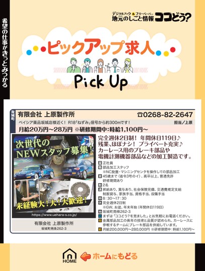 有限会社上原製作所ベイシア薬品坂城店様近く!R18「ねずみ」信号から約300mです!月給20万円〜28万円※研修期間中:時給1,100円〜☎0268-82-2647担当/上原次世代のNEWスタッフ募集!未経験大!大!大歓迎!https://www.uehara-s.co.jp/有限会社上原製作所坂城町南条262-3完全週休2日制!年間休日119日♪残業、ほぼナシ!プライベート充実♪カーレース用のブレーキ部品や電機計測機器部品などの加工製造です。正社員部品加工スタッフ※NC旋盤・マシニングセンタを操作しての部品加工45歳まで(省令3号のイ)、高卒以上、普通免許研修期間あり2名昇給あり、賞与あり、社会保険完備、交通費規定支給制服貸与、家族手当、資格手当、役職手当8:30〜17:30完全週休2日制※GW、お盆、年末年始(年間休日119日)坂城町南條262-3まずは「ココどう?を見ました」とお気軽にお電話ください。金属部品加工の長年の技術と品質が認められ、カーレースに参戦するチームにブレーキ部品を供給しています。月給200,000円〜280,000円※研修期間中:時給1,100円〜希望の仕事がきっとみつかる坂城町