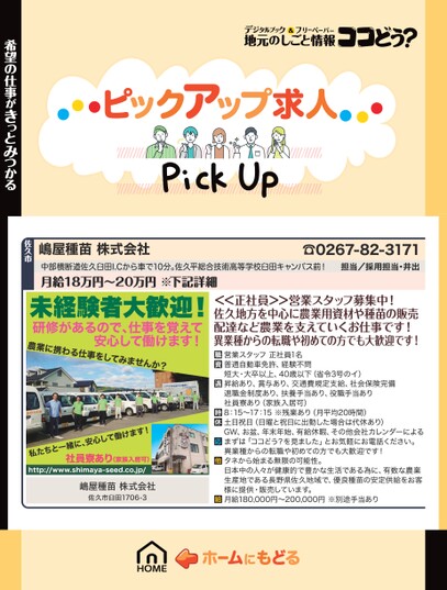 ☎0267-82-3171担当/採用担当・井出<<正社員>>営業スタッフ募集中!佐久地方を中心に農業用資材や種苗の販売配達など農業を支えていくお仕事です!異業種からの転職や初めての方でも大歓迎です!営業スタッフ正社員1名普通自動車免許、経験不問短大・大卒以上、40歳以下(省令3号のイ)昇給あり、賞与あり、交通費規定支給、社会保険完備退職金制度あり、扶養手当あり、役職手当あり社員寮あり(家族入居可)8:15〜17:15※残業あり(月平均20時間)土日祝日(日曜と祝日に出勤した場合は代休あり)GW、お盆、年末年始、有給休暇、その他会社カレンダーによるまずは「ココどう?を見ました」とお気軽にお電話ください。異業種からの転職や初めての方でも大歓迎です!タネから始まる無限の可能性。日本中の人々が健康的で豊かな生活である為に、有数な農業生産地である長野県佐久地域で、優良種苗の安定供給をお客様に提供・販売しています。月給180,000円〜200,000円※別途手当ありたちと一私緒に、安心して働けます!社員寮あり(家族入居可)http://www.shimaya-seed.co.jp/嶋屋種苗株式会社佐久市臼田1706-3嶋屋種苗株式会社中部横断道佐久臼田I.Cから車で10分。佐久平総合技術高等学校臼田キャンパス前!月給18万円〜20万円※下記詳細未経験者大歓迎!農業に携わる仕事をしてみませんか?研修があるので、仕事を覚えて安心して働けます!希望の仕事がきっとみつかる佐久市