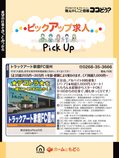 トラックアート歌麿FC信州R18「大屋西」信号を東京特殊電線様に向かい、すぐ近くです!☎0268-35-3666担当/川元[正]月給20万円〜30万円※年齢・経験により変わります。[ア]時給1,000円〜★デコトラ★を一緒につくりませんか!♪正社員、アルバイト同時募集![パ・ア]★時給1,000円スタート!もちろん未経験からスタートOK!9:00からの仕事で、朝もゆっくりです♪サービススタッフ※正社員、パート・アルバイト各2〜3名[正]未経験者OK!普通自動車免許(AT限定不可)※整備士資格あれば尚可※もちろん資格がなくてもOKです![ア]未経験でOK!フリーター、Wワーク大歓迎♪[正]昇給あり、賞与あり、各種社会保険完備、制服貸与交通費規定支給、退職金制度あり、試用期間6ヶ月あり[ア]昇給あり、服装自由(作業着)、正社員登用あり[正]9:00〜17:30※春・冬のタイヤ交換時期は残業になる事があります。[ア]1日3〜4時間勤務でOK![正]月6〜8日(月曜定休、他)、GW、お盆、年末年始[ア]週1日〜勤務OK!(土日働ける方大歓迎!)まずは「ココどう?を見ました」とお気軽にお電話ください。[正]月給200,000円〜300,000円※年齢・経験でスタート給与が変わります。[ア]時給1,000円〜※頑張り次第で時給アップ!https://utamaro-shinshu.co.jp/株式会社office川元上田市大屋25-1希望の仕事がきっとみつかる上田市