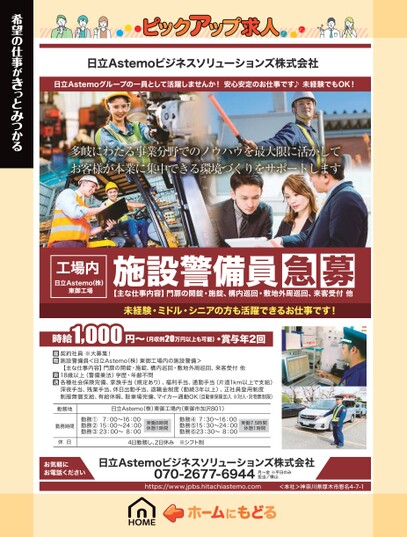 未経験・ミドル・シニアの方も活躍できるお仕事です!日立Astemoビジネスソリューションズ株式会社日立Astemoグループの一員として活躍しませんか!安心安定のお仕事です♪未経験でもOK!希望の仕事がきっとみつかる工場内日立Astemo株)東御工場施設警備員急募【主な仕事内容】門扉の開錠・施錠、構内巡回・敷地外周巡回、来客受付他1,000円〜時給(月収例20万円以上も可能)・賞与年2回契約社員※大募集!施設警備員<日立Astemo(株)東御工場内の施設警備>【主な仕事内容】門扉の開錠・施錠、構内巡回・敷地外周巡回、来客受付他18歳以上(警備業法)学歴・年齢不問各種社会保険完備、家族手当(規定あり)、福利手当、通勤手当(片道1km以上で支給)深夜手当、残業手当、休日出勤手当、退職金制度(勤続3年以上)、正社員登用制度制服無償支給、有給休暇、駐車場完備、マイカー通勤OK(自動車保険加入※対人・対物無制限)勤務地勤務時間休日日立Astemo(株)東御工場内(東御市加沢801)勤務①7:00〜16:00勤務②15:00〜24:00勤務③23:00〜8:00実働8時間休憩1時間勤務④7:30〜16:00勤務⑤15:30〜24:00勤務⑥23:30〜8:00実働7.5時間休憩1時間4日勤務し、2日休み※シフト制お気軽にお電話ください日立Astemoビジネスソリューションズ株式会社070-2677-6944https://www.jpbs.hitachiastemo.com月〜金※平日のみ担当/横山<本社>神奈川県厚木市恩名4-7-1
