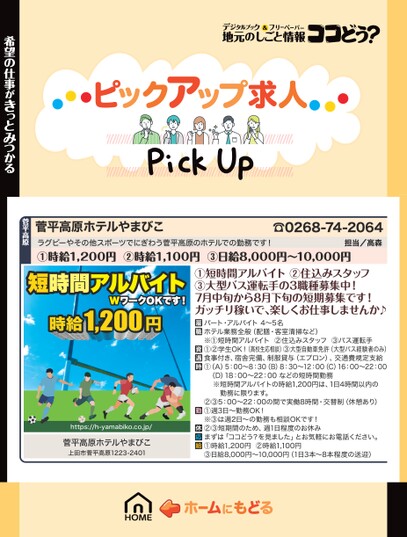 菅平高原ホテルやまびこ☎0268-74-2064ラグビーやその他スポーツでにぎわう菅平高原のホテルでの勤務です!①時給1,200円②時給1,100円③日給8,000円〜10,000円担当/高森希望の仕事がきっとみつかる菅平高原短時間アルバイトWワークOKです!①短時間アルバイト②住込みスタッフ③大型バス運転手の3職種募集中!7月中旬から8月下旬の短期募集です!ガッチリ稼いで、楽しくお仕事しませんか♪パート・アルバイト4〜5名ホテル業務全般(配膳・客室清掃など)※①短時間アルバイト②住込みスタッフ③バス運転手①②学生OK!(高校生応相談)③大型自動車免許(大型バス経験者のみ)食事付き、宿舎完備、制服貸与(エプロン)、交通費規定支給①(A)5:00〜8:30(B)8:30〜12:00(C)16:00〜22:00(D)18:00〜22:00などの短時間勤務※短時間アルバイトの時給1,200円は、1日4時間以内の勤務に限ります。②③5:00〜22:00の間で実働8時間・交替制(休憩あり)①週3日〜勤務OK!※③は週2日〜の勤務も相談OKです!②③短期間のため、週1日程度のお休みまずは「ココどう?を見ました」とお気軽にお電話ください。①時給1,200円②時給1,100円③日給8,000円〜10,000円(1日3本〜8本程度の送迎)https://h-yamabiko.co.jp/菅平高原ホテルやまびこ上田市菅平高原1223-2401