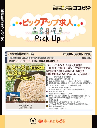 ☎080-6938-1338担当/森田小木曽製粉所上田店R18長野方面から踏入の信号手前大きな看板が目印です時給1,000円〜(土日祝:時給1,050円〜)上田市希望の仕事がきっとみつかる勤務OK♪日時間〜2〜33週1日Wワーク歓迎!https://www.ogiso-seifunjo.com/株式会社モリタ上田市常入1-11-59パート・アルバイト5名〜大募集!一般・学生・主婦(夫)・Wワーク希望も大歓迎!学生にはうれしい美味しい賄付き!研修期間もあるので安心してご応募を!パート・アルバイト5名大募集!接客やレジなどのサービススタッフ年齢・学歴不問、主婦(夫)、学生、一般、Wワークも歓迎!交通費規定支給、制服貸与、おいしい賄付き、社員登用制度あり10:00〜20:00の間で、1日3時間〜働ける方※シフト制・ご相談に応じます!※ガッツリ稼ぎたい、働きたいなどの希望も応相談!週2〜3日から勤務OK!※土日祝のみもご相談に応じます!まずは「ココどう?を見ました」とお気軽にお電話ください。店舗はつながりにくいため携帯までご連絡ください。担当森田まで未経験の方でも皆で協力してサポートします。お子さんお持ちのママさんでも時間帯など相談ください。平日:時給1,000円〜土日祝:時給1,050円〜
