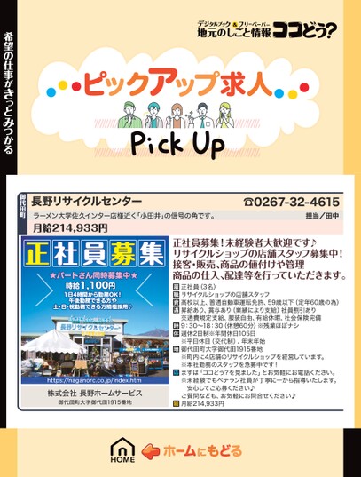 ☎0267-32-4615担当/田中長野リサイクルセンターラーメン大学佐久インター店様近く「小田井」の信号の角です。月給214,933円御代田町希望の仕事がきっとみつかる正社員募集★パートさん同時募集中★時給1,100円1日4時間から勤務OK!午後勤務できる方や土・日・祝勤務できる方積極採用♪https://naganorc.co.jp/index.htm株式会社長野ホームサービス御代田町大字御代田1915番地正社員募集!未経験者大歓迎です♪リサイクルショップの店舗スタッフ募集中!接客・販売、商品の値付けや管理商品の仕入、配達等を行っていただきます。正社員(3名)リサイクルショップの店舗スタッフ高校以上、普通自動車運転免許、59歳以下(定年60歳の為)昇給あり、賞与あり(業績により支給)社員割引あり交通費規定支給、服装自由、有給休暇、社会保険完備9:30〜18:30(休憩60分)※残業ほぼナシ週休2日制※年間休日105日※平日休日(交代制)、年末年始御代田町大字御代田1915番地※町内に4店舗のリサイクルショップを経営しています。※本社勤務のスタッフを急募中です!まずは「ココどう?を見ました」とお気軽にお電話ください。※未経験でもベテラン社員が丁寧に一から指導いたします。安心してご応募ください♪ご質問なども、お気軽にお問合せください♪月給214,933円