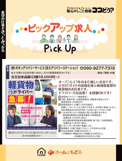 ☎090-9277-7319担当/浅田・大森オープンして1年のまだ新しい会社です。大手ECサイトの荷物を運ぶ地域密着型の軽貨物のお仕事です。ドライバー5名急募!未経験OKです!軽貨物ドライバー(業務委託)学歴、経験不問、未経験者歓迎、経験者も歓迎します!要普通免許(AT限定可)研修制度あり(日額11,500円保証)車輛リースについてもご紹介できます。お気軽ご連絡ください。委託準備金30,000円支給(入社祝い金)※入社1ヶ月後<法令改定により>開始前に受ける必要があります。・貨物軽自動車安全管理者講習(5時間程度)受講料金3,700円(税込)・初任運転者特別教育指導記録簿(修了証)(5時間程度)受講料金3,300円(税込)9:00〜22:00の間で裁量による勤務曜日、日数ご相談ください。※平日休みも可能完全出来高制(日額18,000円〜)<月報酬例>稼働20日×日報酬19,000円以上=月報酬380,000円以上可能(株)ギオンデリバリーサービス(佐久デリバリーステーション)佐久市佐久方面から臼田方面へ向かい、R141美里南信号カドです。完全出来高制(日額18,000円〜)軽貨物急募!ドライバー業務委託週3日勤務からOK!稼げる!日額18,000円〜https://kk-gion.co.jp/company/group/giondeliveryservice/(株)ギオンデリバリーサービス(佐久デリバリーステーション)佐久市臼田美里1334-1希望の仕事がきっとみつかる