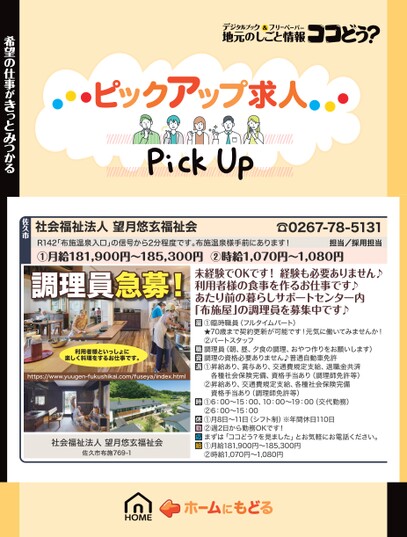 社会福祉法人望月悠玄福祉会☎0267-78-5131R142「布施温泉入口」の信号から2分程度です。布施温泉様手前にあります!①月給181,900円〜185,300円②時給1,070円〜1,080円担当/採用担当希望の仕事がきっとみつかる佐久市調理員急募!未経験でOKです!経験も必要ありません♪利用者様の食事を作るお仕事です♪あたり前の暮らしサポートセンター内「布施屋」の調理員を募集中です♪利用者様といっしょに楽しく料理をするお仕事です。https://www.yuugen-fukushikai.com/fuseya/index.html社会福祉法人望月悠玄福祉会佐久市布施769-1①臨時職員(フルタイムパート)★70歳まで契約更新が可能です!元気に働いてみませんか!②パートスタッフ調理員(朝、昼、夕食の調理、おやつ作りをお願いします)調理の資格必要ありません♪普通自動車免許①昇給あり、賞与あり、交通費規定支給、退職金共済各種社会保険完備、資格手当あり(調理師免許等)②昇給あり、交通費規定支給、各種社会保険完備資格手当あり(調理師免許等)①6:00〜15:00、10:00〜19:00(交代勤務)②6:00〜15:00①月8日〜11日(シフト制)※年間休日110日②週2日から勤務OKです!まずは「ココどう?を見ました」とお気軽にお電話ください。①月給181,900円〜185,300円②時給1,070円〜1,080円
