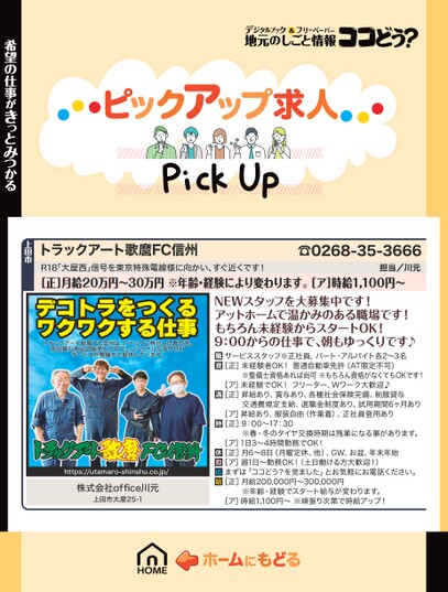 トラックアート歌麿FC信州R18「大屋西」信号を東京特殊電線様に向かい、すぐ近くです!☎0268-35-3666担当/川元[正]月給20万円〜30万円※年齢・経験により変わります。[ア]時給1,100円〜デコトラをつくるワクワクする仕事トラックアート歌麿FC信州は、トラックに特化した専門店。高品質な商品の販売とプロフェッショナルな取り付けサービスや整備をご提供しています。https://utamaro-shinshu.co.jp/株式会社office川元上田市大屋25-1NEWスタッフを大募集中です!アットホームで温かみのある職場です!もちろん未経験からスタートOK!9:00からの仕事で、朝もゆっくりです♪サービススタッフ※正社員、パート・アルバイト各2〜3名[正]未経験者OK!普通自動車免許(AT限定不可)※整備士資格あれば尚可※もちろん資格がなくてもOKです![ア]未経験でOK!フリーター、Wワーク大歓迎♪[正]昇給あり、賞与あり、各種社会保険完備、制服貸与交通費規定支給、退職金制度あり、試用期間6ヶ月あり[ア]昇給あり、服装自由(作業着)、正社員登用あり[正]9:00〜17:30※春・冬のタイヤ交換時期は残業になる事があります。[ア]1日3〜4時間勤務でOK![正]月6〜8日(月曜定休、他)、GW、お盆、年末年始[ア]週1日〜勤務OK!(土日働ける方大歓迎!)まずは「ココどう?を見ました」とお気軽にお電話ください。[正]月給200,000円〜300,000円※年齢・経験でスタート給与が変わります。[ア]時給1,100円〜※頑張り次第で時給アップ!希望の仕事がきっとみつかる上田市