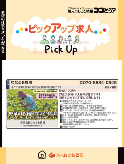 Wワークの方、多数活躍中!子育て中の方にも働きやすい職場です時給1,100円〜野菜の収穫・手入れのお仕事です!初めての方でも丁寧に指導します!野菜の収穫お手伝いしてくれませんか?2025年6月下旬〜11月下旬頃までズッキーニ、ミニトマト、ネギ等を栽培しています合同会社ななとも農場佐久市岩村田2865-3野菜の生産スタッフ(パート)4名※野菜の収穫・手入れ・箱詰めなど年齢不問、未経験者歓迎!要普通自動車免許交通費規定支給(1日200円)、労災、作業手当あり9:00〜12:00・9:00〜16:00(昼休み1時間)※お子さんの送迎等で上記に当てはまらない場合も是非ご相談下さい。シフト制のため応相談※勤務時期・期間など応相談佐久市岸野・高瀬まずは「ココどう?を見ました」とお気軽にお電話ください。暑くなるので空調服の貸出しあります。規格外野菜の持ち帰りできます。時給1,100円〜希望の仕事がきっとみつかる佐久市ななとも農場佐久市岸野と高瀬にある当社農園が勤務先です!☎070-8534-0945担当/勝野