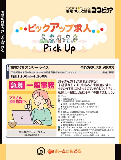 急募一般事務ママさん多数活躍中♪株式会社オンリーライス上田市五加969-1お子さんの手が離れた方など未経験からでも、もちろん大歓迎です♪イチから丁寧に教えますので、安心してください。私達と一緒に元気にイキイキ働きましょう♪パート一般事務スタッフ学歴・経験不問、普通自動車免許★30歳〜60歳の方が活躍しています!★お子さんの手が離れた方にピッタリです♪2〜3名昇給あり、交通費規定支給、社会保険完備有給休暇、正社員登用制度あり9:00〜17:00週3〜4日勤務でOKです!★週5日勤務も、もちろんOKです!★勤務日数などご相談ください!まずは「ココどう?を見ました」とお気軽にお電話ください♪主なお仕事は、受注から指示書までのお仕事をお願いします。数量等のシール貼りも行っていただきます。主な取引先は、ホテル・スーパー・旅館・仕出し店等です。☎0268-38-6663担当/飯塚株式会社オンリーライス下本郷西を塩田中学校に向かい、塩田家具様手前を左折してすぐ!時給1,100円〜1,200円上田市希望の仕事がきっとみつかる