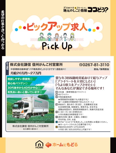 ☎0267-81-3110担当/採用担当株式会社謙信信州がんこ村営業所中部横断自動車道「八千穂高原IC」から1分です!通勤楽々!月給20万円〜27万円佐久穂町希望の仕事がきっとみつかる相談しやすい雰囲気◎居心地バツグン◎30代後半から40代が中心◎和気あいあいと働いています◎https://www.kenshin-aichi.com/株式会社謙信信州がんこ村営業所佐久穂町八郡39-1賞与年3回&随時昇給ありで給与アップ「プライベートを大切にしたい」「今より収入をアップさせたい」そんなあなたが満足できる場所です!正社員(青果物配送ドライバー)4tドライバー中型自動車免許★青果業界未経験でも大歓迎です♪★1〜2週間の同乗研修で安心のスタート♪昇給あり、賞与あり(年3回)、交通費規定支給社会保険完備、制服貸与、家族手当、歩合手当退職金制度あり、資格取得補助あり、残業代別途支給6:00〜15:00(休憩95分)※月の残業20時間程度です!週休2日制(基本:水曜日、日曜日)年末年始、GW、お盆まずは「ココどう?を見ました」とお気軽にお電話ください。★ホームページからもご応募可能です♪月給200,000円〜270,000円※月収(例)300,000円以上可能です!