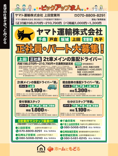 ヤマト運輸株式会社上田営業所ヤマト運輸株式会社東北信エリア6営業所で募集中!☎070-8809-8291担当/採用担当[正]月給198,070円〜210,790円[パ]時給1,000円〜1,300円千曲戸倉ヤマト運輸株式会社正社員・パート大募集!上田月給198,070円〜210,790円+交通費別途支給2t車メインの集配ドライバー正社員常磐城坂城上田丸子【資格】普通自動車免許(AT限定可/取得後1年以上)、45歳まで(キャリア形成の為)【待遇】昇給あり、賞与(年2回)、各種手当あり、社会保険完備、慶弔見舞金贈呈(結婚祝金、出産祝金、入学祝金)、社員持株制度、退職金制度あり、制服貸与、育児休業、介護休業【時間】1日の所定8時間、1週間の上限所定を40時間(月平均165時間)※休憩60分(シフト例)8:00〜21:00/8:00〜19:00/8:00〜17:00/13:00〜21:00など【休日】月9日〜11日(シフト制)※年間休日118日+計画年休6日+記念日休暇3日★1週間連続休暇あり(シフトを調整し、家族旅行に行く社員も多数います)(歩合給含む)月収例●30代、3年目、残業25時間扶養家族あり⇒340,000円独身⇒320,000円※運ぶ物量により歩合給あり2t車メインの集配ドライバー「昼」パート上田1,100時給円〜軽自動車の集配ドライバー「夜」パート戸倉千曲丸子1,300時給上田円〜【時間】8:00〜16:00の間で1日4時間〜勤務OK!【待遇】交通費規定支給、制服貸与【勤務日数】週3日勤務〜勤務OK【時間】16:00〜20:00の1日4時間勤務【待遇】交通費規定支給、制服貸与【勤務日数】週3日勤務〜勤務OK受付事務スタッフパート戸倉千曲坂城常磐城1,000円〜時給仕分けスタッフ「早朝」パート千曲戸倉1,100坂城円〜時給常磐城【時間】8:00〜19:00の間で1日4時間〜勤務OK!【待遇】交通費規定支給、制服貸与【勤務日数】週3日勤務〜勤務OK【時間】5:00〜8:00の1日3時間勤務【待遇】交通費規定支給、制服貸与【勤務日数】週3日勤務〜勤務OK6営業所でスタッフ募集中!ご希望の営業所へ「ココどう?を見ました」とお気軽にお電話ください。●上田営業所上田市大字古里111-2070-8809-8291担当/採用担当●信州丸子営業所上田市中丸子1728-1080-5068-0240担当/採用担当千曲市大字新田718080-5068-0294●千曲営業所●戸倉上山田営業所千曲市大字上徳間中村393-2担当/採用担当●信州坂城営業所埴科郡坂城町中之条中沢39-1●常磐城営業所上田市常磐城2248-1080-5481-6245担当/採用担当東北信エリア希望の仕事がきっとみつかる