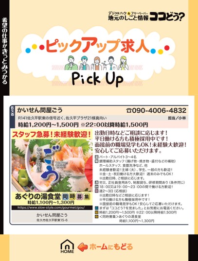 R141佐久平駅東の信号近く、佐久平プラザ21様真向い時給1,200円〜1,500円※22:00以降時給1,500円スタッフ急募!未経験歓迎!あぐりの湯食堂時給1,100円〜1,300円同時募集https://www.slow-style.com/gourmet/gou/かいせん問屋ごう佐久市佐久平駅東15-6出勤日時などご相談に応じます!平日働ける方も積極採用中です!面接前の職場見学もOK!未経験大歓迎!安心してご応募いただけます。パート・アルバイト3〜4名調理補助スタッフ(揚げ物・焼き物・盛付などの補助)ホールスタッフ、食器洗浄など、他未経験者歓迎!主婦(夫)、学生、一般の方も歓迎!※金・土・祝日働ける方大歓迎!週末のみでもOK!※出勤日時、ご相談に応じます。労災、正社員登用あり、制服貸与、研修期間あり(条件同じ)18:00又は19:00〜23:00の間で働ける方歓迎!週2〜3日(応相談)※出勤日時などご相談に応じます!※平日働ける方も積極採用中です!※面接前の職場見学もOK!安心してご応募いただけます。まずは「ココどう?を見ました」とお気軽にお電話ください。時給1,200円〜1,500円※22:00以降時給1,500円<同時募集>あぐりの湯食堂時給1,100円〜1,300円希望の仕事がきっとみつかる佐久市かいせん問屋ごう☎090-4006-4832担当/小林