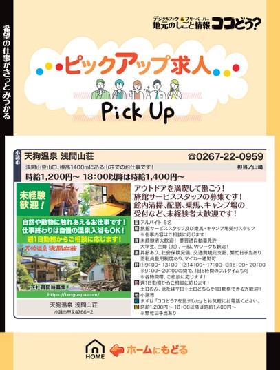 ☎0267-22-0959担当/山崎天狗温泉浅間山荘浅間山登山口、標高1400mにある山荘でのお仕事です!時給1,200円〜18:00以降は時給1,400円〜小諸市希望の仕事がきっとみつかる未経験歓迎!自然や動物に触れあえるお仕事です!仕事終わりは自慢の温泉入浴もOK!週1日勤務からご相談に応じます!正社員同時募集!https://tenguspa.com/天狗温泉浅間山荘小諸市甲又4766-2アウトドアを満喫して働こう!旅館サービススタッフの募集です!館内清掃、配膳、乗馬、キャンプ場の受付など、未経験者大歓迎です!アルバイト5名旅館サービススタッフ及び乗馬・キャンプ場受付スタッフ※仕事内容はご相談に応じます!未経験者大歓迎!要普通自動車免許大学生、主婦(夫)、一般、Wワークも歓迎!昇給あり、社会保険完備、交通費規定支給、繁忙日手当あり正社員登用制度あり、マイカー通勤可①9:00〜13:00②14:00〜17:00③16:00〜20:00※9:00〜20:00の間で、1日8時間のフルタイムも可※各時間帯、ご相談に応じます!週1日勤務からご相談に応じます!土日のみ、または平日+土日どちらか1日勤務できる方歓迎!小諸市まずは「ココどう?を見ました」とお気軽にお電話ください。時給1,200円〜18:00以降は時給1,400円〜※繁忙日手当あり