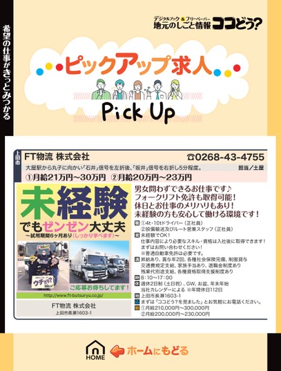 ☎0268-43-4755担当/土屋男女問わずできるお仕事です♪フォークリフト免許も取得可能!休日とお仕事のメリハリもあり!未経験の方も安心して働ける環境です!①4t・10tドライバー(正社員)②設備輸送及びルート営業スタッフ(正社員)未経験でOK!仕事内容により必要なスキル・資格は入社後に取得できます!まずはお問い合わせください!※普通自動車免許は必要です。昇給あり、賞与年2回、各種社会保険完備、制服貸与交通費規定支給、家族手当あり、退職金制度あり残業代別途支給、各種資格取得支援制度あり8:10〜17:00週休2日制(土日祝)、GW、お盆、年末年始当社カレンダーによる※年間休日112日上田市長瀬1603-1まずは「ココどう?を見ました」とお気軽にお電話ください。①月給210,000円〜300,000円②月給200,000円〜230,000円ご応募お待ちしてます!http://www.ft-butsuryu.co.jp/FT物流株式会社上田市長瀬1603-1FT物流株式会社大屋駅から丸子に向かい「石井」信号を左折後、坂井」信号を右折し5分程度。①月給21万円〜30万円②月給20万円〜23万円未経験でもゼンゼン大丈夫〜試用期間6ヶ月あり(しっかり学べます)〜希望の仕事がきっとみつかる上田市