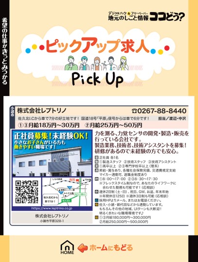 佐久北I.Cから車で7分の好立地です!国道18号「平原」信号からは車で6分です!①③月給18万円〜30万円②月給25万円〜50万円正社員募集!未経験OK!小さなお子さんがいる方も働きやすい職場です!力を測る、力覚センサの開発・製造・販売を行っている会社です。製造業務、技術者、技術アシスタントを募集!研修があるので未経験の方でも安心。正社員各1名①製造スタッフ②技術スタッフ③技術アシスタント①高卒以上②③専門学校卒以上(理系)昇給・賞与あり、各種社会保険完備、交通費規定支給マイカー通勤可、退職金制度あり①8:00〜17:00②③8:30〜17:30※フレックスタイム制なので、あなたのライフワークに合わせた勤務も可能です!(応相談)週休2日制(土・日)、祝日、GW、お盆、年末年始※年間休日125日※週休3日制も可能(応相談)採用HPよりメール、またはお電話ください。佐久・小諸・御代田などから通勤しています。もちろんその他の地域、UIターンも大歓迎!明るくきれいな職場環境です♪①③月給180,000円〜300,000円②月給250,000円〜500,000円https://www.leptrino.co.jp株式会社レプトリノ小諸市平原328-1希望の仕事がきっとみつかる小諸市株式会社レプトリノ☎0267-88-8440担当/渡辺・中沢