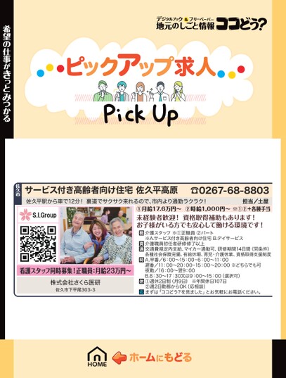 サービス付き高齢者向け住宅佐久平高原☎0267-68-8803佐久平駅から車で12分!裏道でサクサク来れるので、市内より通勤ラクラク!担当/土屋①月給17.6万円〜②時給1,000円〜※①②+各種手当未経験者歓迎!資格取得補助もあります!お子様がいる方でも安心して働ける環境です!希望の仕事がきっとみつかる佐久市看護スタッフ同時募集!正職員:月給23万円〜株式会社さくら医研佐久市下平尾303-3介護スタッフ※①正職員②パート※A.サービス付き高齢者向け住宅B.デイサービス介護職員初任者研修修了以上交通費規定内支給、マイカー通勤可、研修期間14日間(同条件)各種社会保険完備、有給休暇、育児・介護休業、資格取得支援制度A.早番/6:00〜15:00・6:00〜11:00遅番/11:00〜20:00・15:00〜20:00※どちらでも可夜勤/16:00〜翌9:00B.8:30〜17:30又は9:00〜15:00(選択可)①週休2日制(月9日)※年間休日107日②週2日勤務からOK(応相談)まずは「ココどう?を見ました」とお気軽にお電話ください。