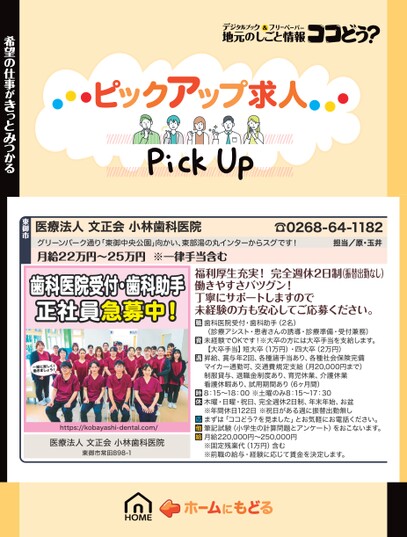 医療法人文正会小林歯科医院グリーンパーク通り「東御中央公園」向かい、東部湯の丸インターからスグです!月給22万円〜25万円※一律手当含む☎0268-64-1182担当/原・玉井希望の仕事がきっとみつかる東御市歯科医院受付・歯科助手正社員急募中!一緒に楽しく!働きましょう!https://kobayashi-dental.com/医療法人文正会小林歯科医院東御市常田898-1福利厚生充実!完全週休2日制(振替出勤なし)働きやすさバツグン!丁寧にサポートしますので未経験の方も安心してご応募ください。歯科医院受付・歯科助手(2名)(診療アシスト・患者さんの誘導・診療準備・受付兼務)未経験でOKです!※大卒の方には大卒手当を支給します。【大卒手当】短大卒(1万円)・四大卒(2万円)昇給、賞与年2回、各種諸手当あり、各種社会保険完備マイカー通勤可、交通費規定支給(月20,000円まで)制服貸与、退職金制度あり、育児休業、介護休業看護休暇あり、試用期間あり(6ヶ月間)8:15〜18:00※土曜のみ8:15〜17:30木曜・日曜・祝日、完全週休2日制、年末年始、お盆※年間休日122日※祝日がある週に振替出勤無しまずは「ココどう?を見ました」とお気軽にお電話ください。筆記試験(小学生の計算問題とアンケート)をおこないます。月給220,000円〜250,000円※固定残業代(1万円)含む※前職の給与・経験に応じて賃金を決定します。
